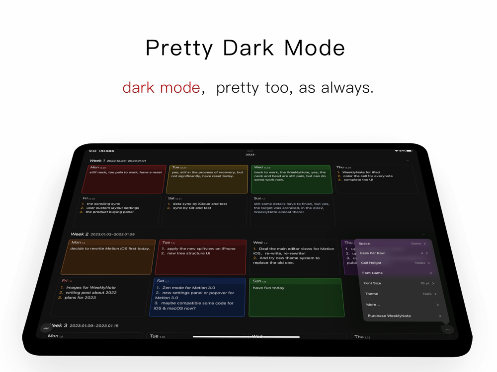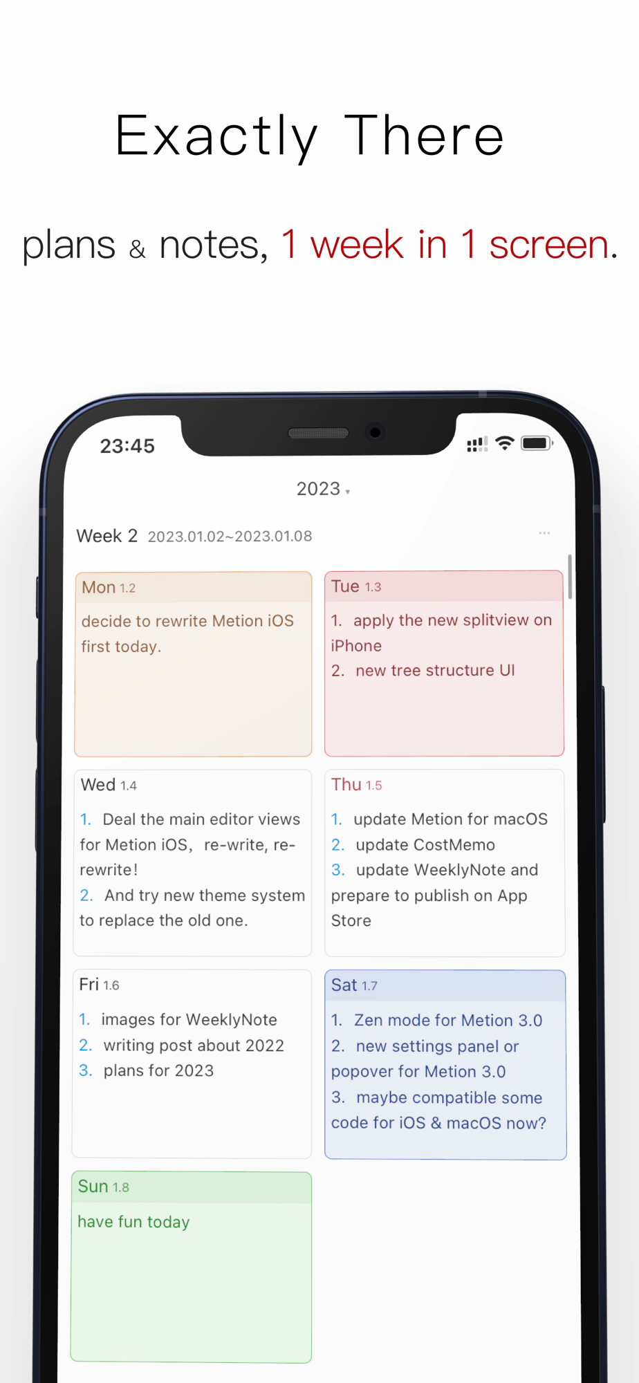 All the recording and writing is done in one screen only, and the 365 days of the year are visualized in "per week" units. You can see everything at a glance, select a day, and start writing directly.