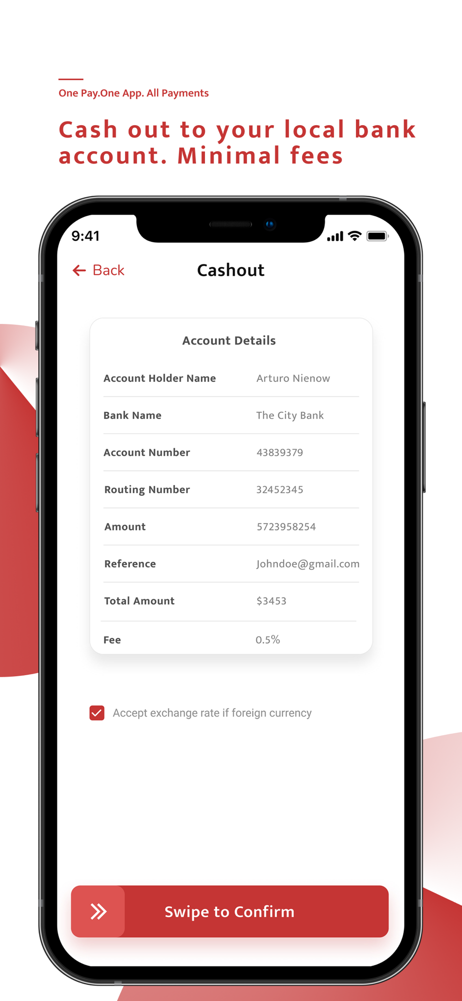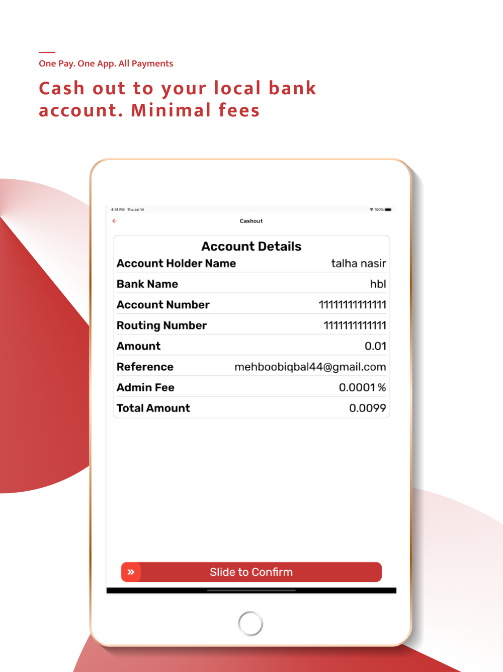 One Pay Wallet is a Money Transfer application that will help you in managing your bank account data. In this application you can send money to other account, receive money from another account, Cash out and also you can add money to your own account. You can also send and receive requests for money