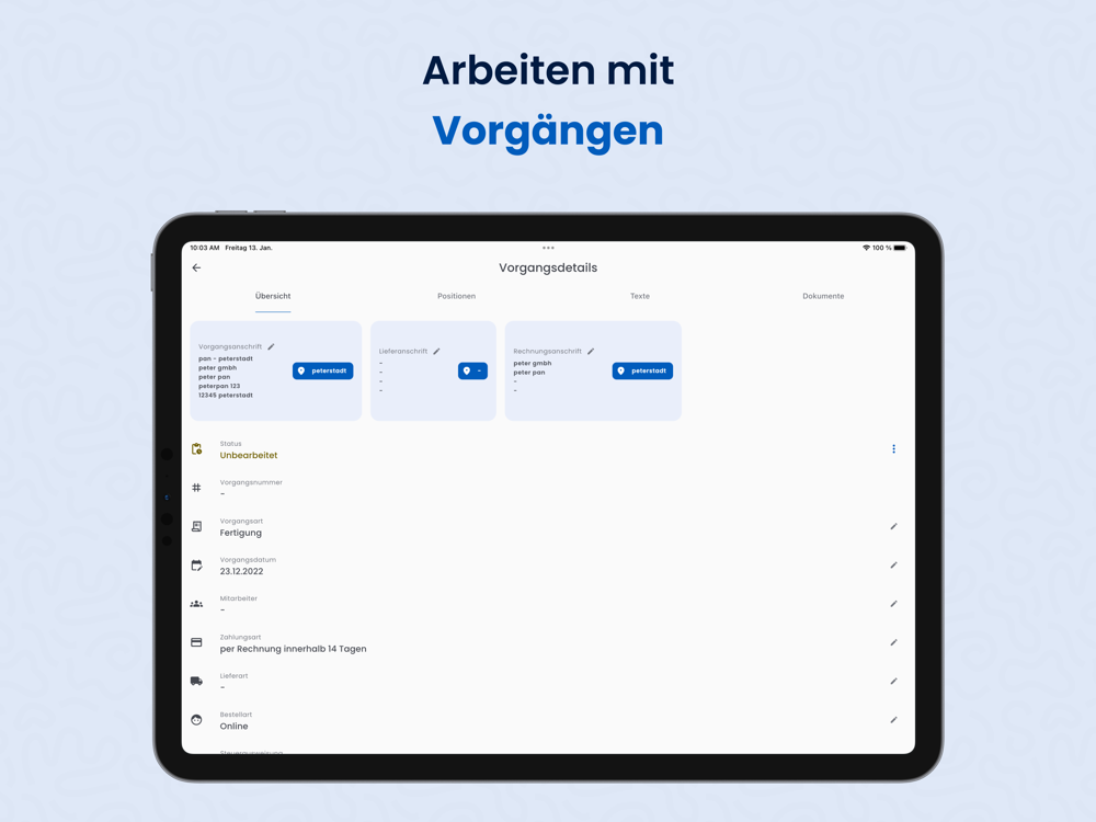 In der App können Sie Vorgangsdetails wie z.B. Vorgangsart, Rechnungs- & Lieferanschrift, Positionen, Vorgangswarnung und viele weitere einsehen.