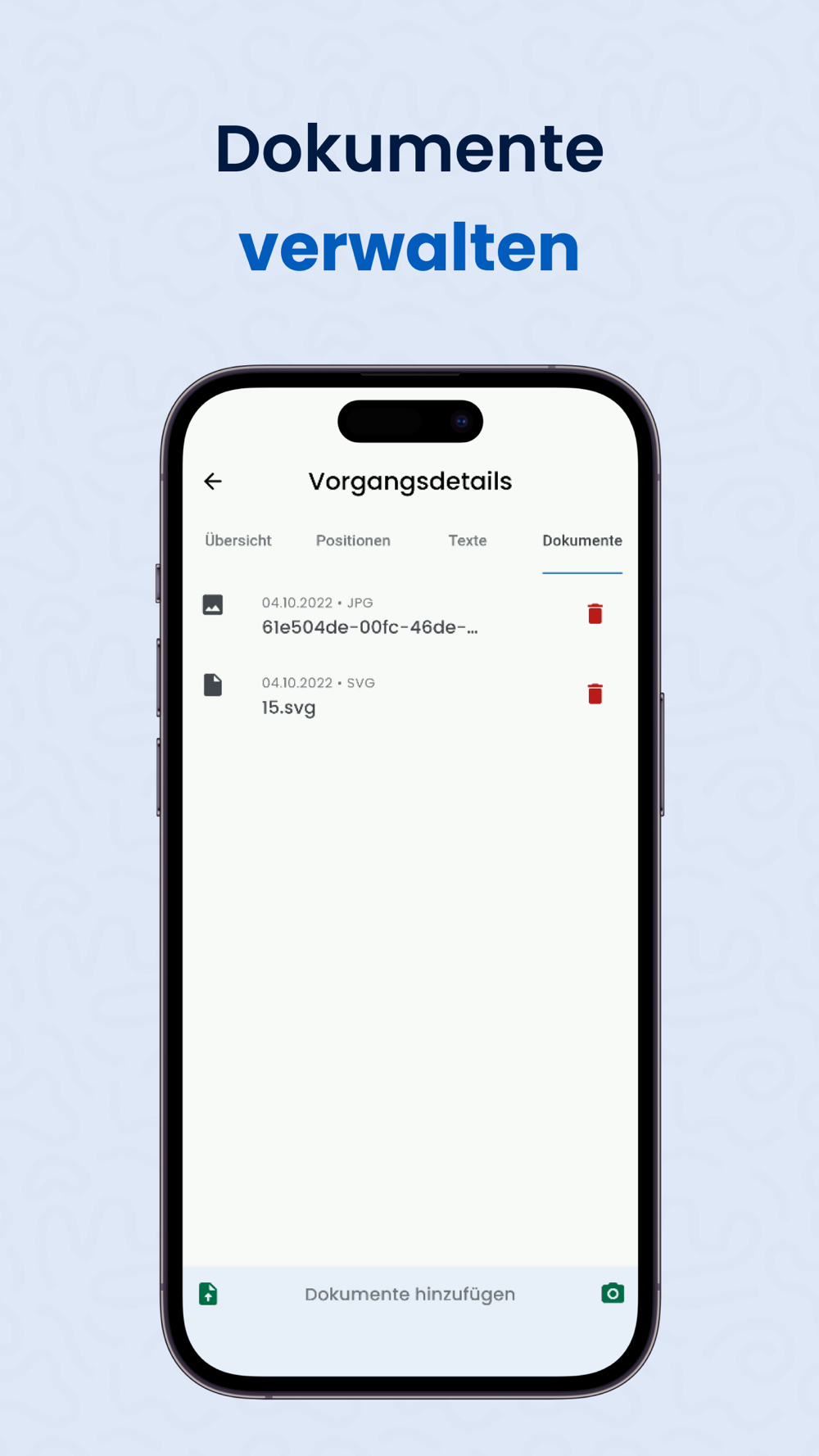 Für Vorgänge, Adressen und Artikel gibt es den Tab "Dokumente", mit dem Bilder und Dateien eingesehen & hinterlegt werden können.