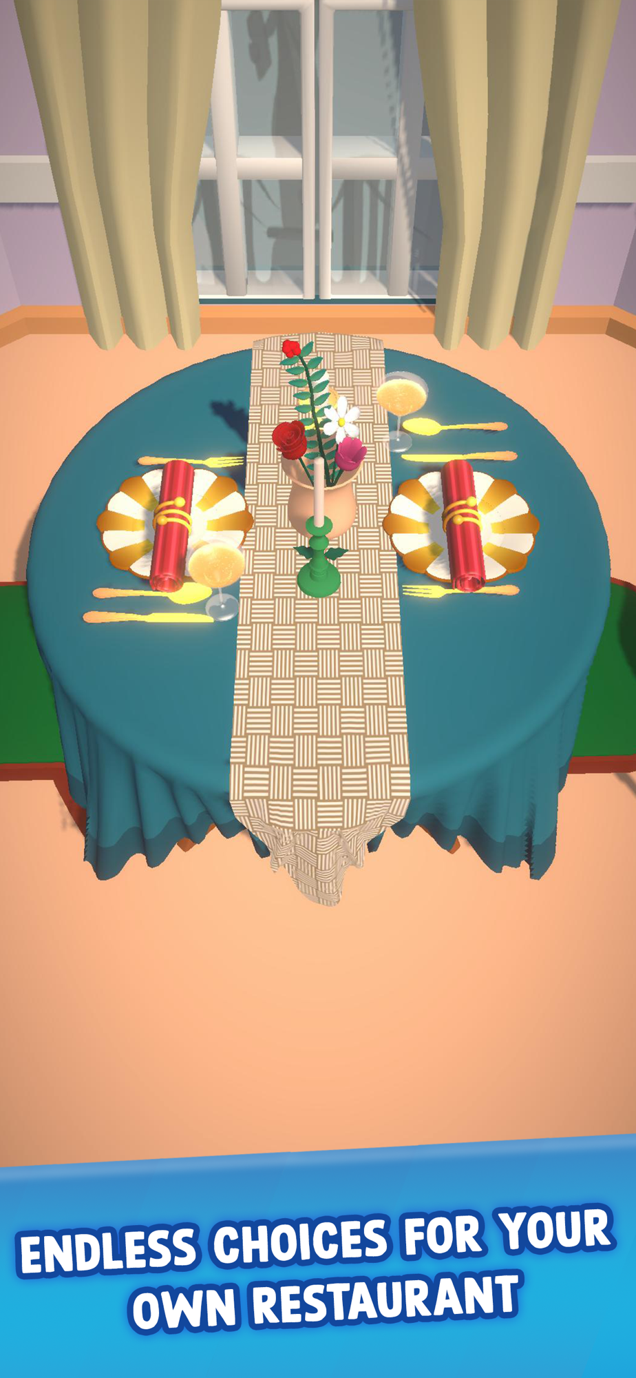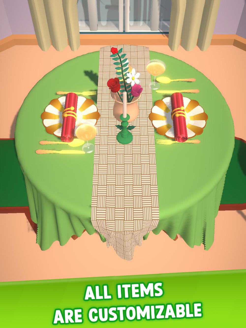 Choose from a rich selection of tables, table cloths and other decorations to create a fancy table for your guests. Each item in this game is customizable in terms of color, shape and texture. Work your creativity to decorate the best for your taste!