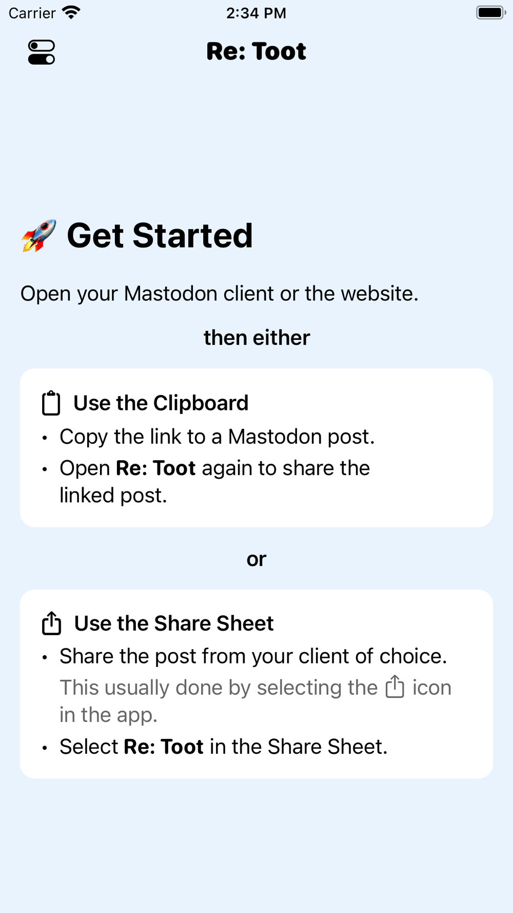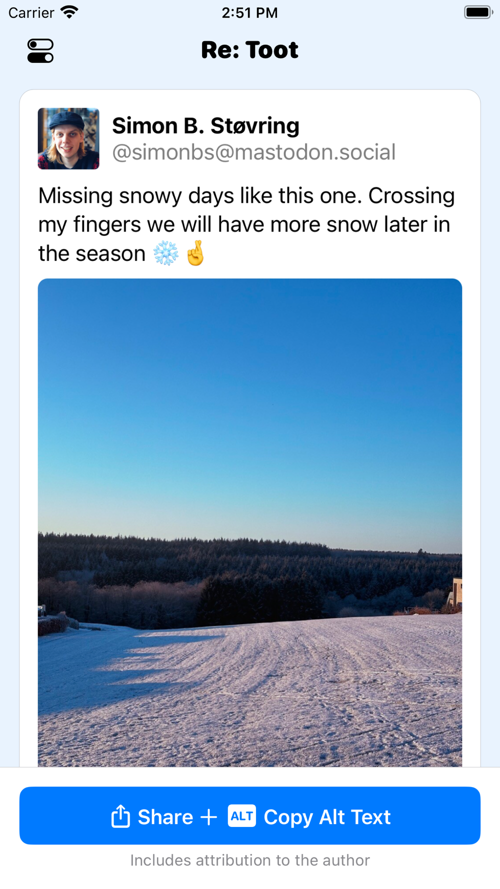 To create an image from a Mastodon post, just copy the link the post and open Re: Toot or invoke the app through the Share Sheet.