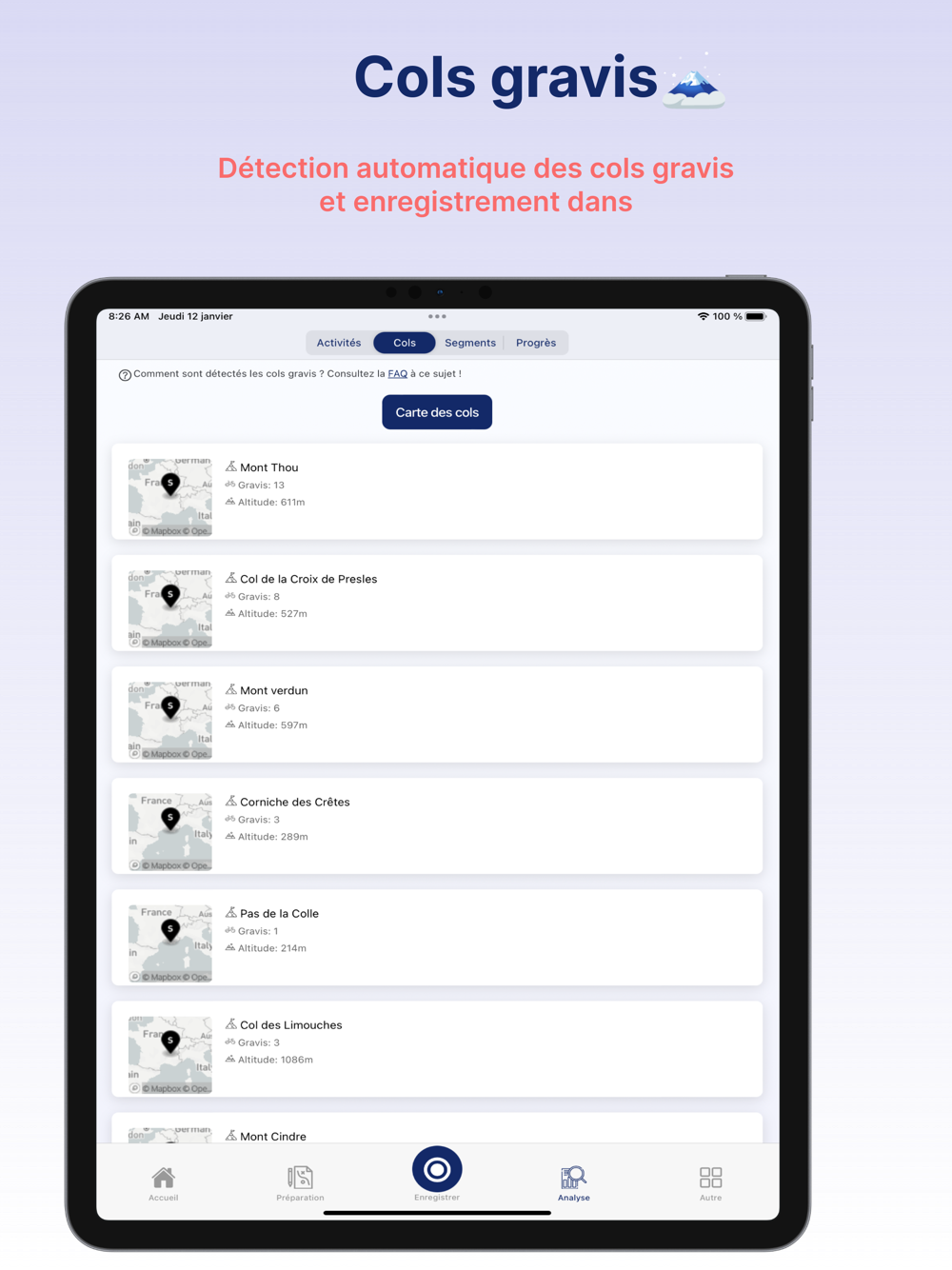 Pour les grimpeurs, à la fin de l'enregistrement GPS de l'activité une analyse est effectuée qui permet de détecter automatiquement les ascensions et cols effectués lors de votre sortie, avec les temps et toutes les informations sur l'ascension (compteur distance en km, dénivelé moyen, dénivelé max, hauteur du col, temps, difficulté, lieu, profil du col par tranche de 100m..).