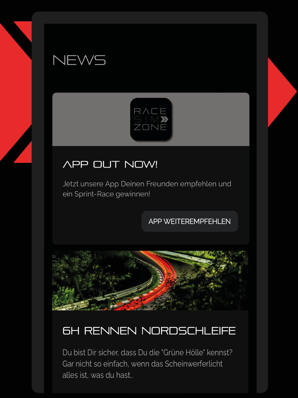Ein Eventbereich wird implementiert, hier siehst du all unsere monatlichen Rennserien auf einen Blick mit Angaben zur Rennstrecke und dem Rennwagen. Direkte Buchung über die App möglich.