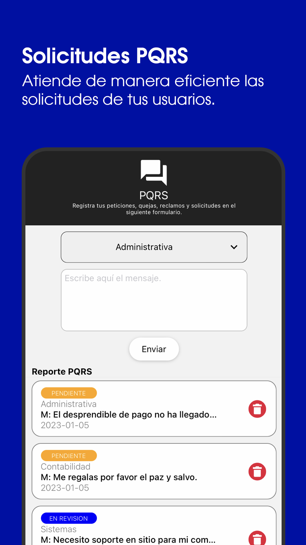 Solicitudes PQRS: tus usuarios podrán contactar fácilmente a las diferentes áreas de la organización o institución educativa, con esto tu personal puede atenderlas por correo electrónico, el administrador gestiona el estado de cada solicitud realizada.