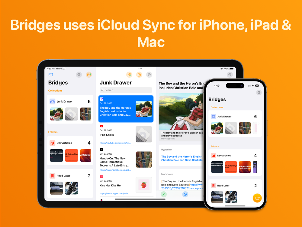 Organize the links into different folders and keep each folder in a section. All your data is stored locally and synced with iCloud so all your devices are up to date. If you download the separate macOS app for Bridges all your links and data will be there.