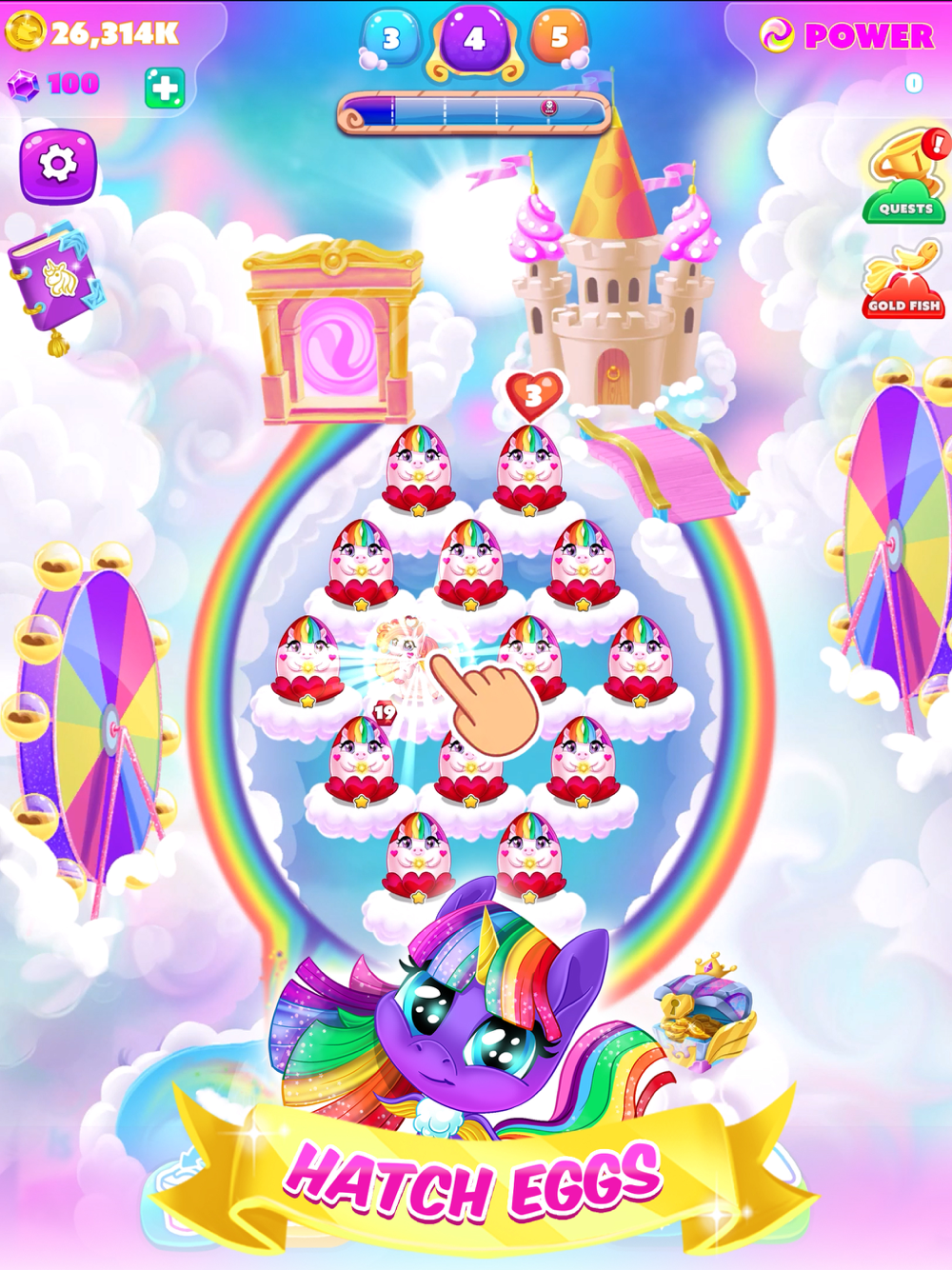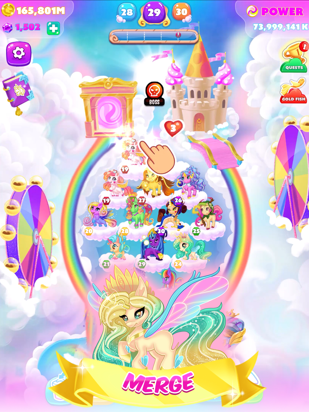Unicornilandia is in danger. The crazy monsters and their bosses attack anyone in sight and only you can save them. Place your unicorns on the fourteen fluffy clouds we designed and make sure your kingdom is safe from any harm. At the beginning of the game, you will be given level 1 unicorns. Merge same-level unicorns to level up. They can be bought from the store. At the end of each level and after defeating the boss you will be rewarded with coins. The coins will be accumulating even when you’re offline and they will be waiting to be collected anytime. There are a lot of exciting quests waiting to be completed. Tap on the top right corner of the screen and make sure you check them out. After their completion, you will be given a couple of purple gems. Catch the magic fish to earn prizes like unicorn eggs, gems, the option to fast forward time to get more gold, and many others. We have a big surprise in store for you: a daily reward. So don’t forget to collect it! Go to the shop and choose the option to time travel for how many hours you want in exchange for diamonds or choose any other alternative available like the starter pack or doubling your coins forever. Use the incubator to hatch new eggs and fill the empty spaces on the clouds you may still have. Sell unicorns that are not to your liking, thus completing one of the most important quests. The monsters will be defeated much more easily if you own higher-level unicorns. Therefore, merge as many as you can and make sure you have fun destroying all the bosses and winning this game.