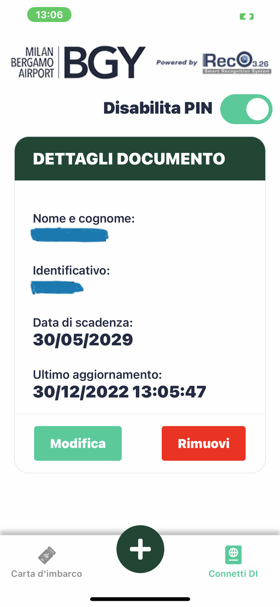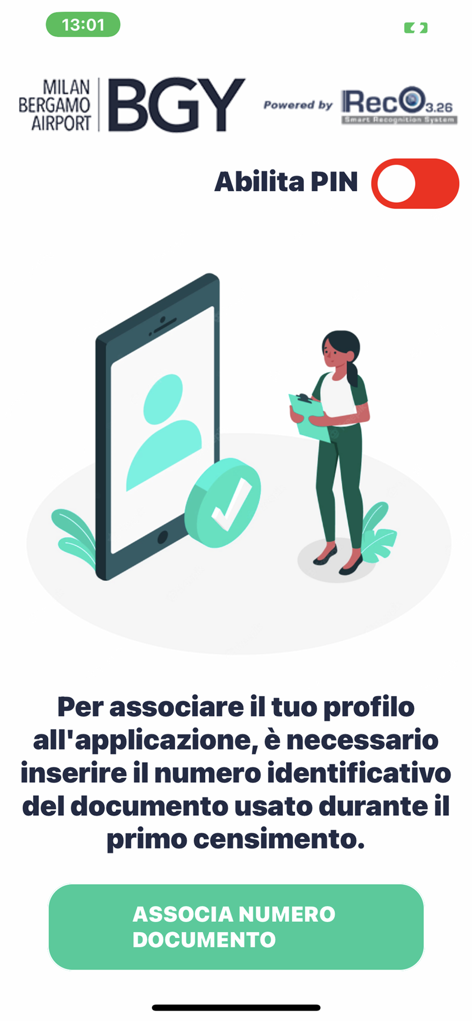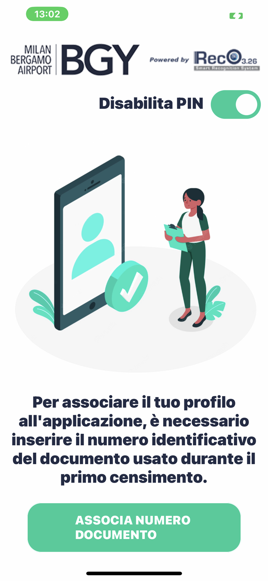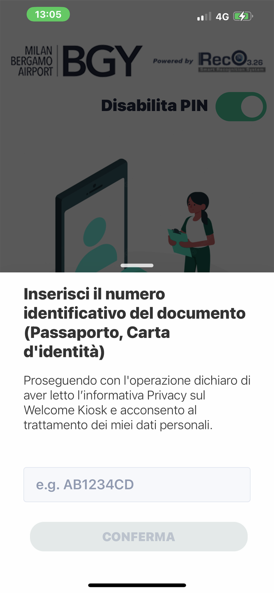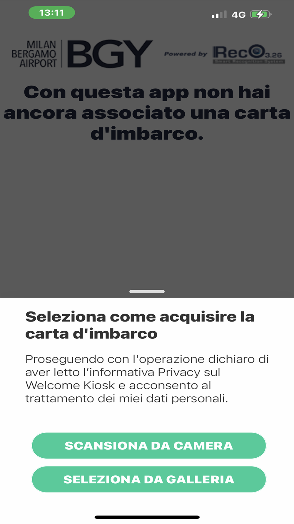 Preregistrazione carta d'imbarco nel sistema di gestione boarding touchless dell'aeroporto di Bergamo Milano
