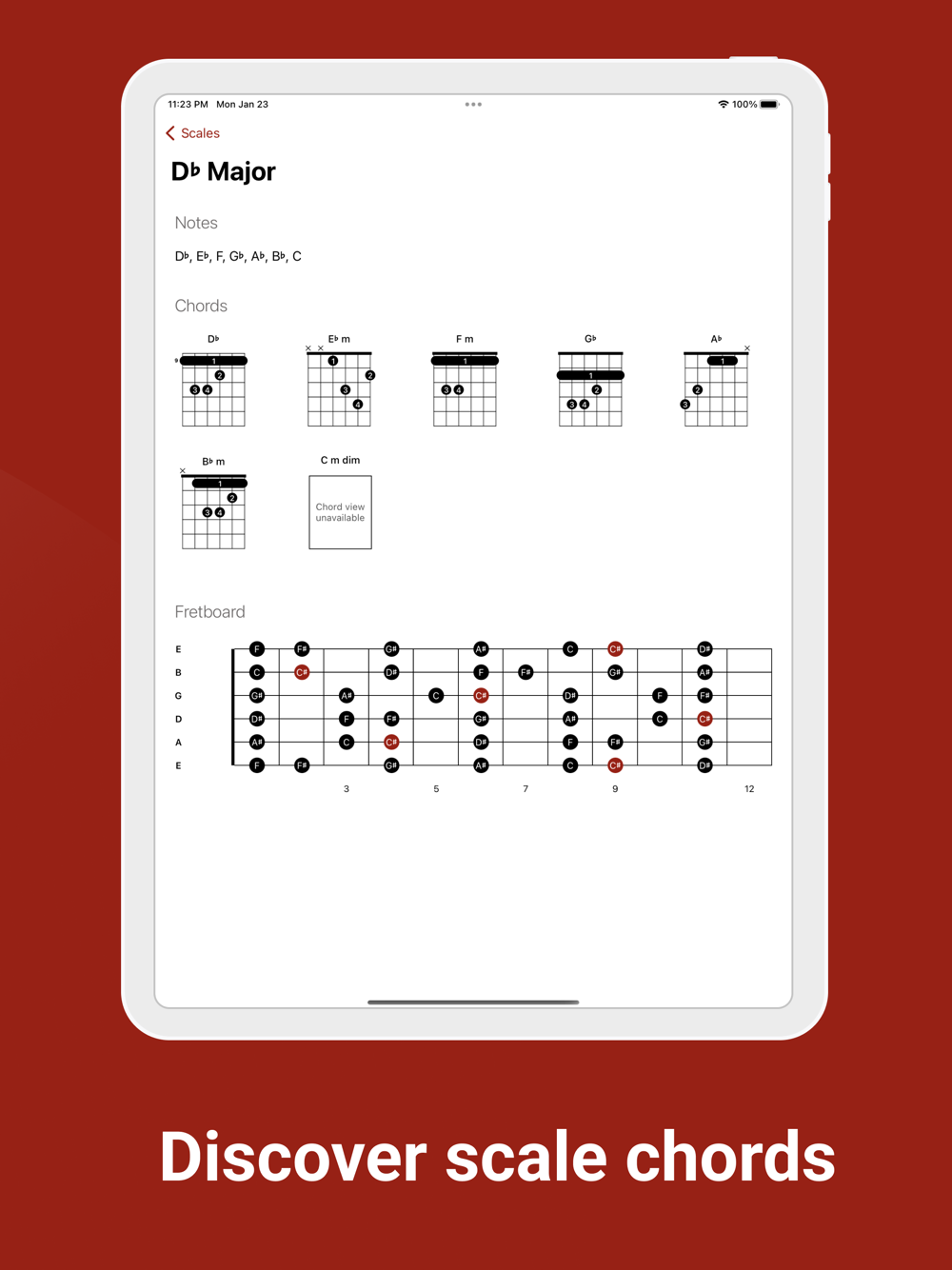 Find any scale and visualise its notes on a fretboard along with the chords associated with it. The ultimate guitar companion app!