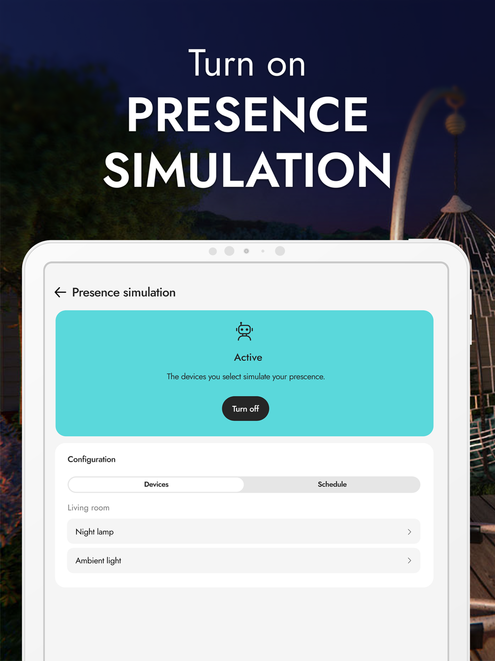 In the application, you will configure and enable the presence simulation function, which will randomly turn on and off selected home installations in a given time period. These may include, among others: lights, sprinklers, electronics as well as blinds and curtains. By creating the illusion of the presence of household members, your home will be safe even when you are not there.