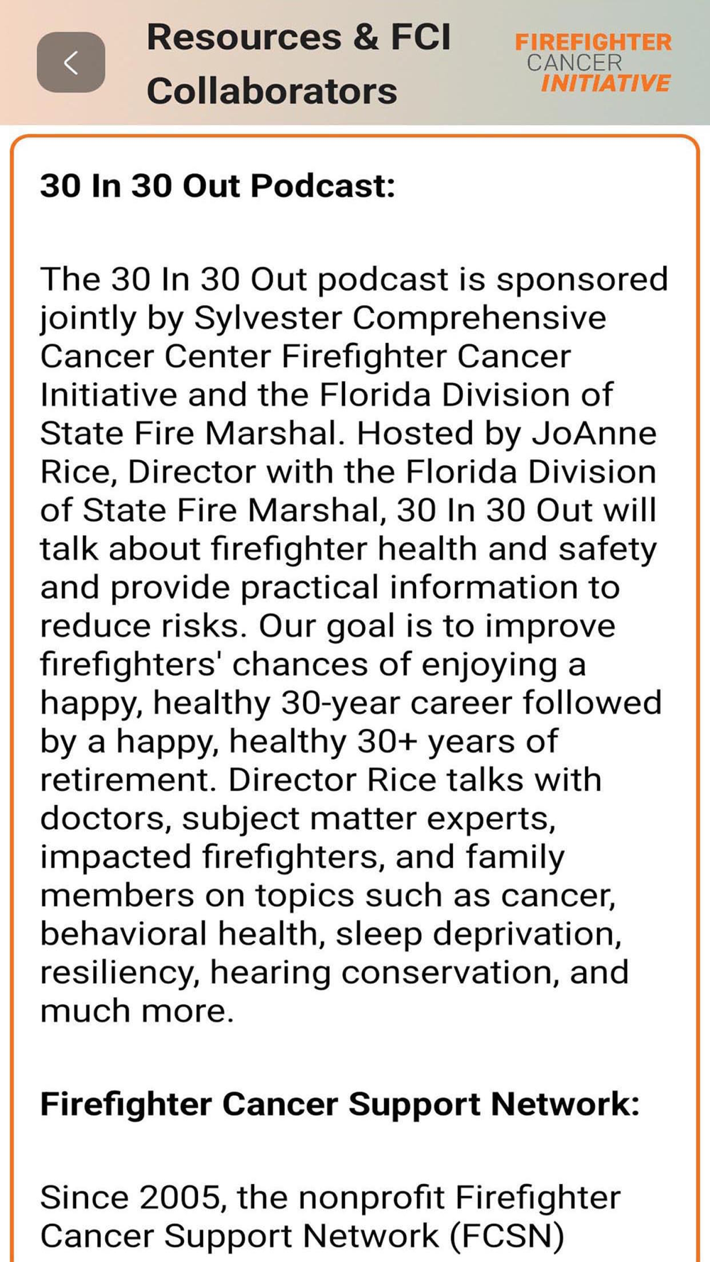 The primary goals of FCI are to better document and understand the excess burden of cancer among Florida firefighters and identify novel, evidence-based methods for reducing risk. The initiative, led by a multidisciplinary team of scientists, healthcare practitioners, and occupational health and safety experts, uses community-engaged approaches to ensure that firefighters’ voices and occupational experiences are reflected throughout all aspects of program planning and implementation.