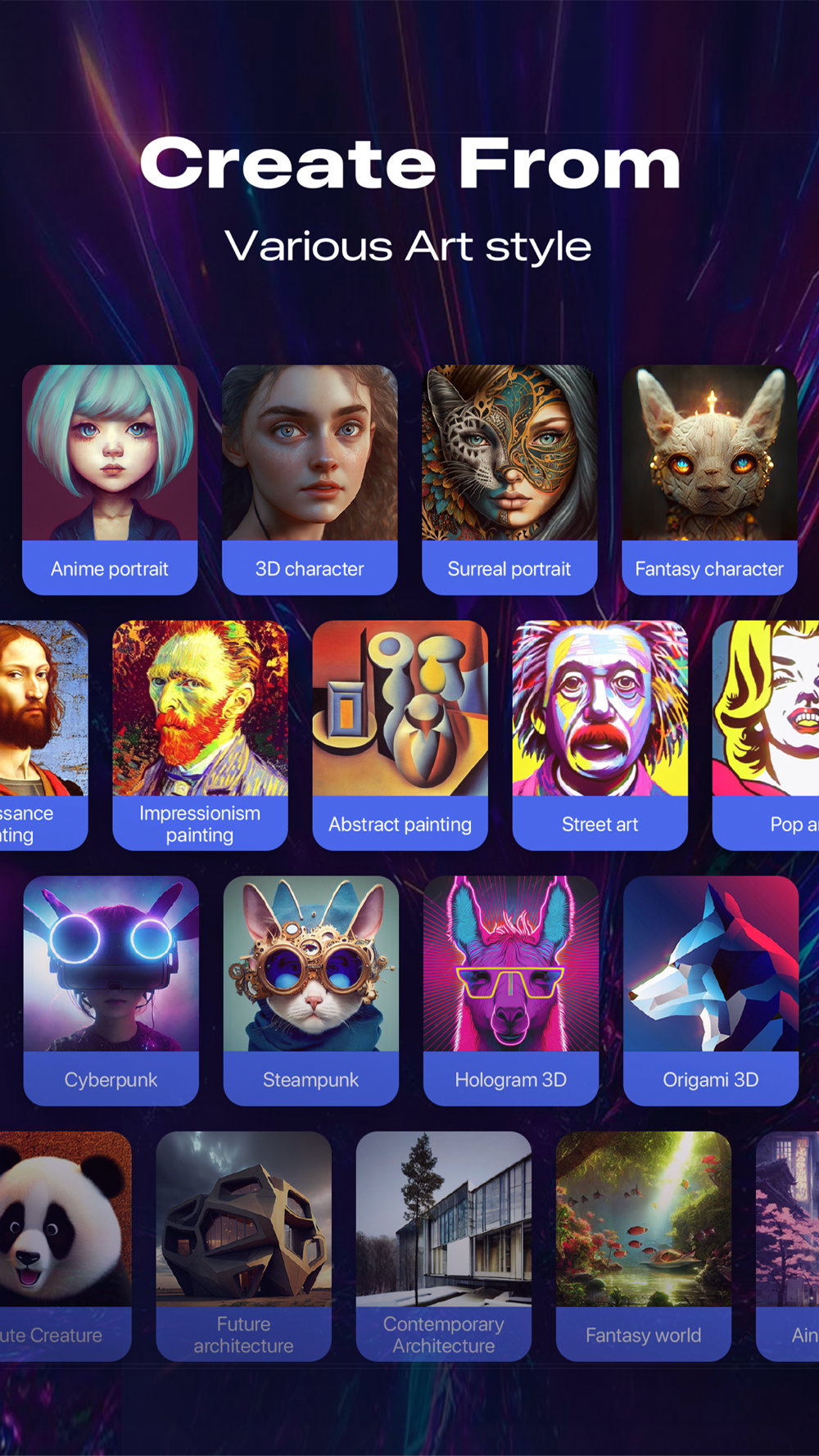Pick an art style! — Whether you’re looking for a vibrant colorful painting or something darker and more dystopian, Dream Art Creator has you covered with an array of selected styles.