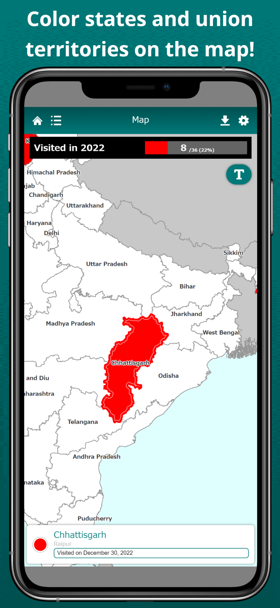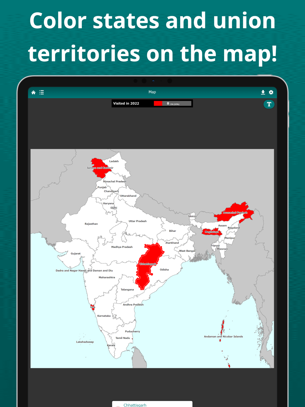 Visualize the states and union territories you have visited on the India map. Tapping a state or union territory on the map, you can edit its color and note. By displaying the labels, you can easily locate states and union territories on the map. The map can be zoomed in and out.
