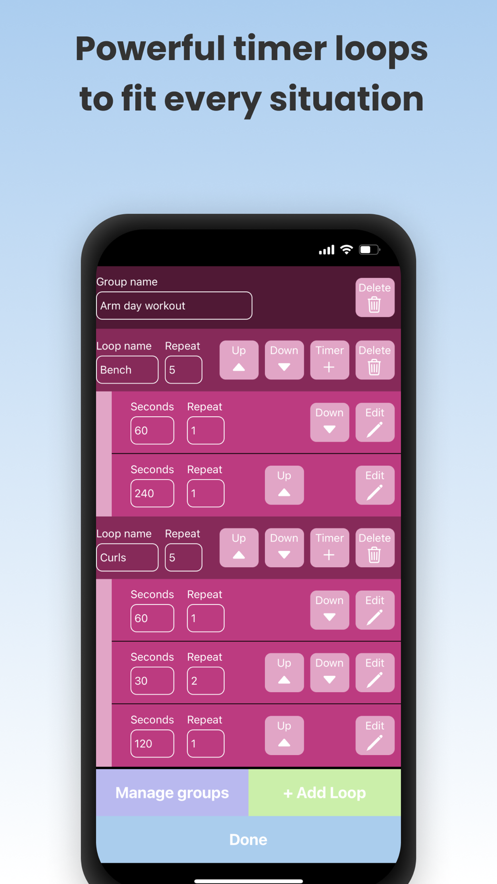 Manage multiple loops of multiple timers that can repeat on a customizable schedule. With Timer Loops, you can create as many timers as you need and customize their duration, label, and repeat frequency.