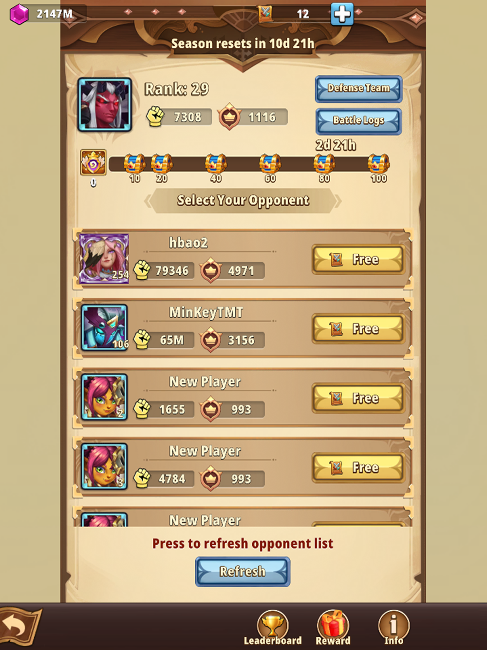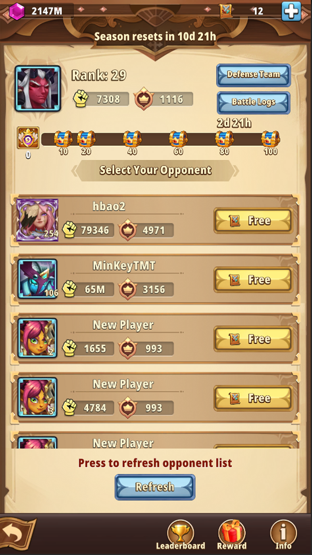 • Put forth your best heroes to do battle in different arenas. Climb the leaderboards for the best rewards at the end of the seasons.