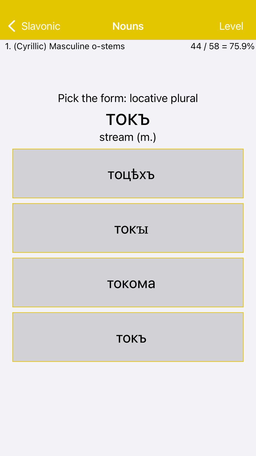• Vocabulary: 165 levels, each testing the meanings of ten Old Church Slavonic words, arranged roughly by their frequency in the Marianus Gospel codex. Interspersed among these are cumulative levels reviewing what has been learned earlier (giving a total of 187 levels).