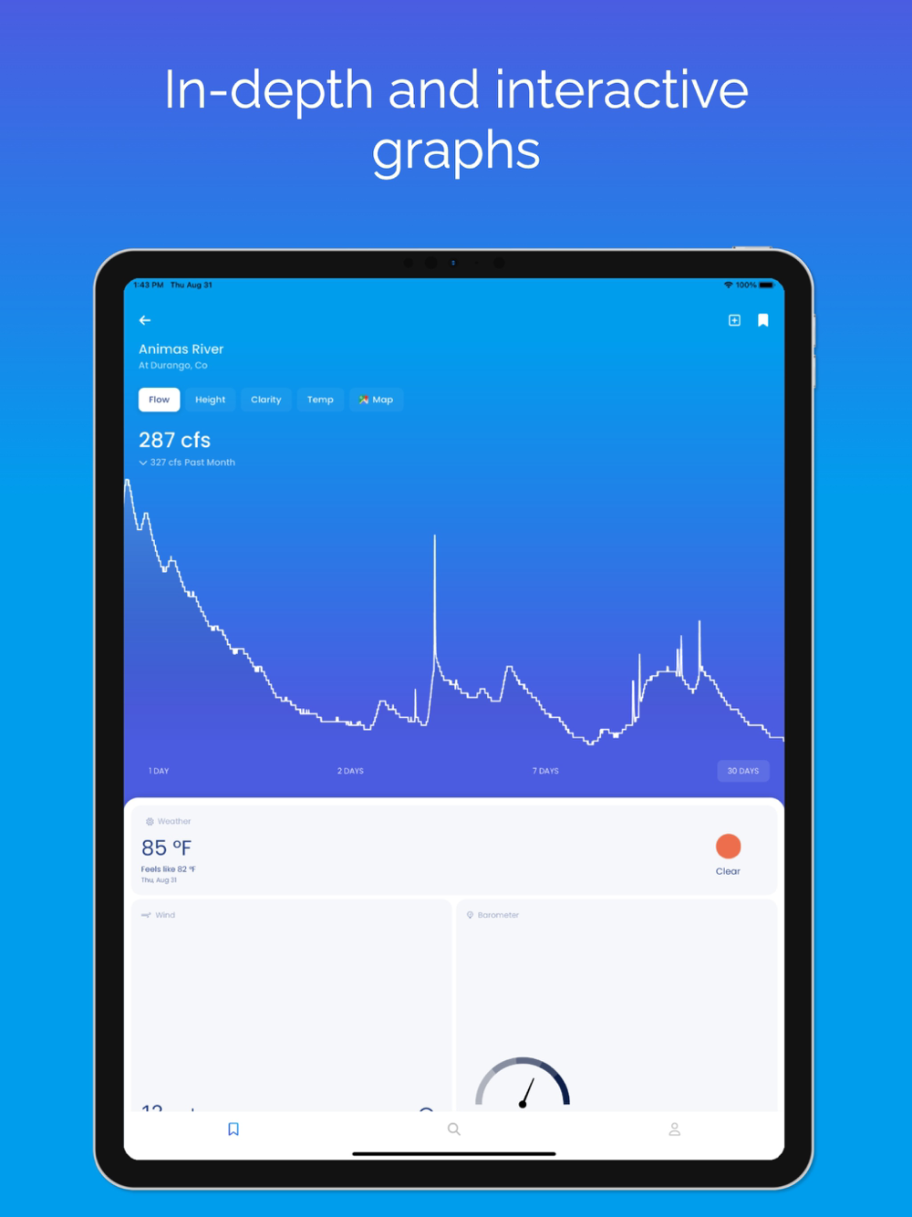 • Gauge levels for flow (cfs), height (ft), clarity (fnu), and temperature (°f) when available.
