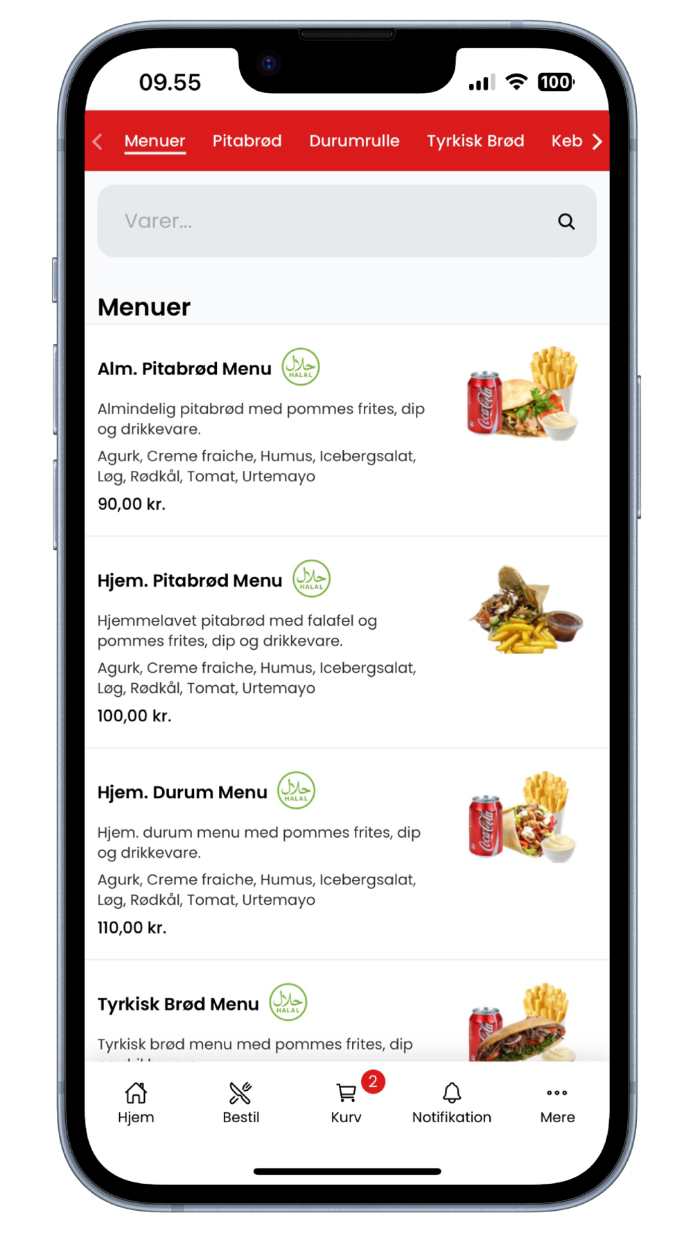 Her finder du: Pitabrød, Durumrulle, Sandwich, Bowl, Retter, Kidsmenu, Diverse, Dips.