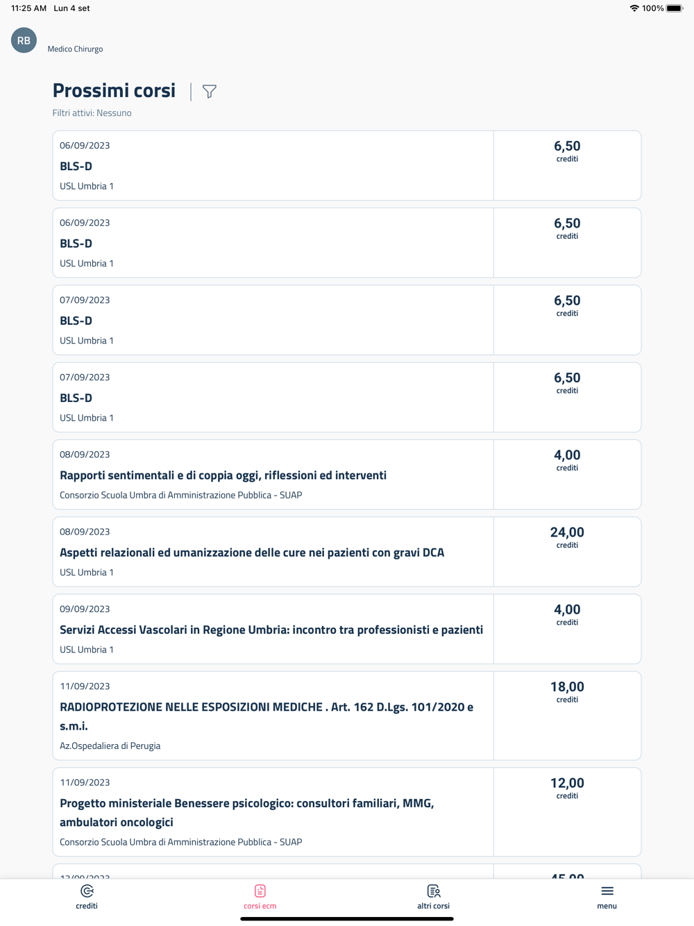 Gli utenti hanno la possibilità di visionare e filtrare tutti i prossimi corsi ECM, accreditati presso la Regione Umbria, che saranno svolti.