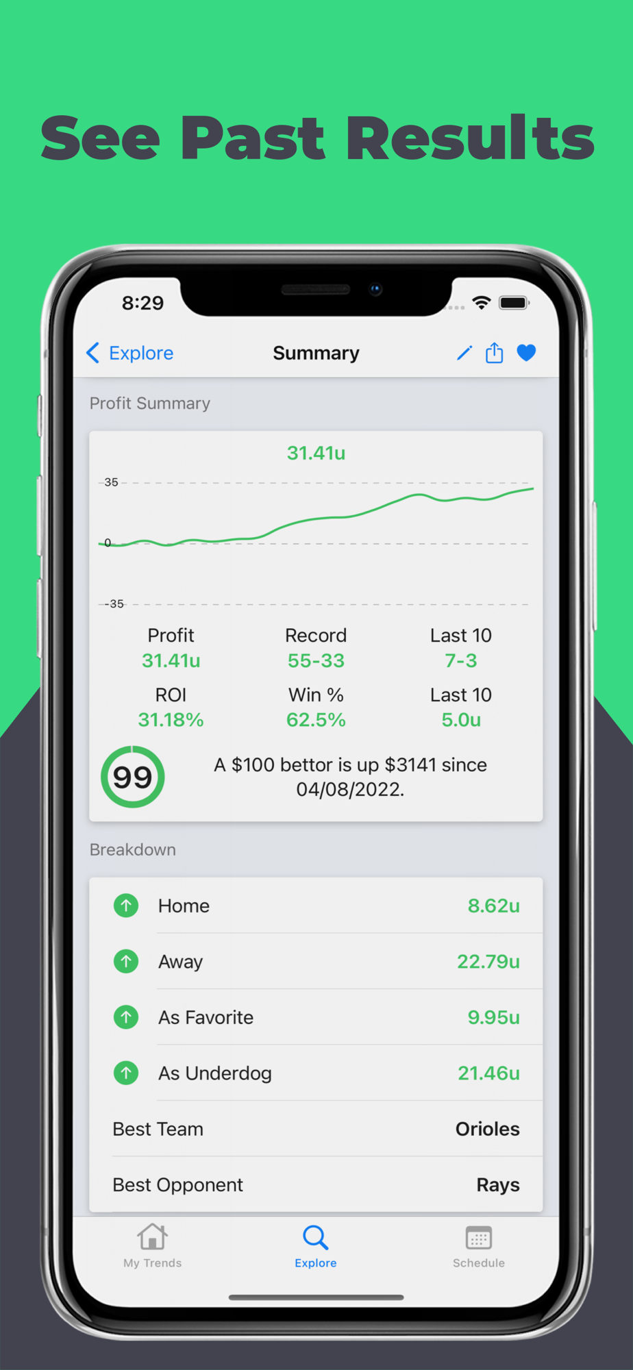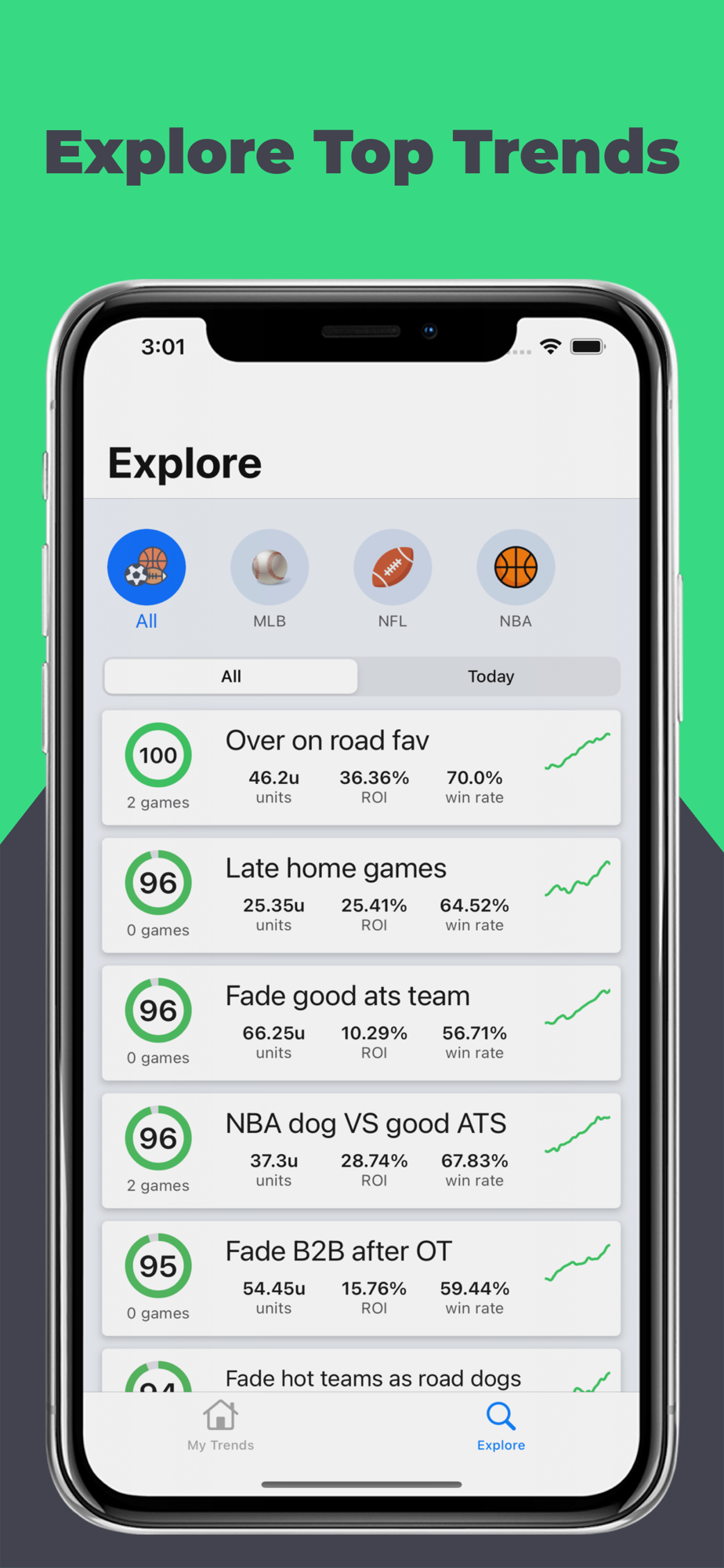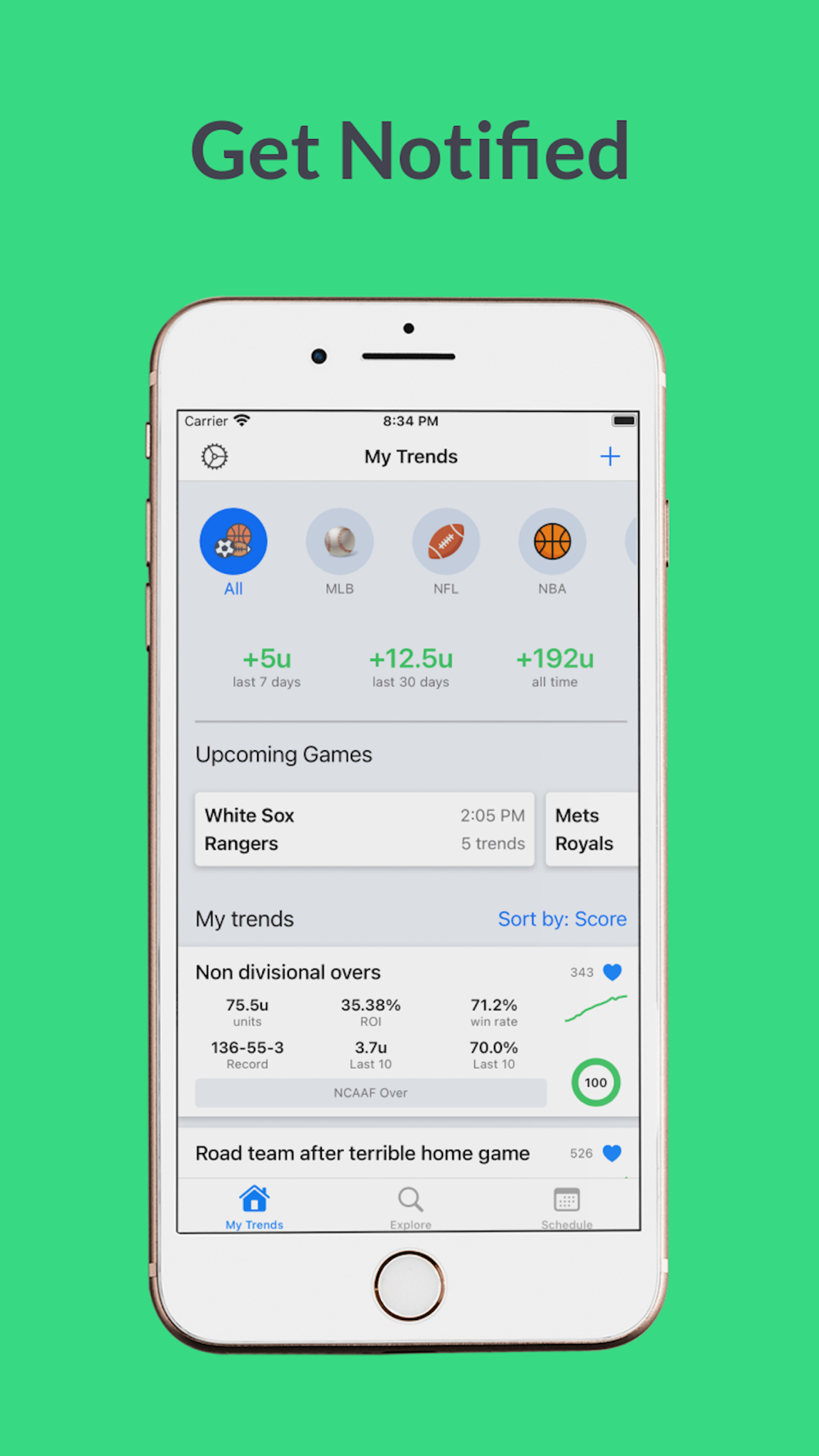 Have you ever wanted to see how much money would have won if you were to bet on sports games with certain criteria? For example, road underdogs in a back to back? Well now you can find out all of that information with just a few taps. Tap on any of the hundreds of filters available, and see what the profit, record, and ROI of that trend has been over the past few decades. Get notified when an upcoming game meets fits that trend.
