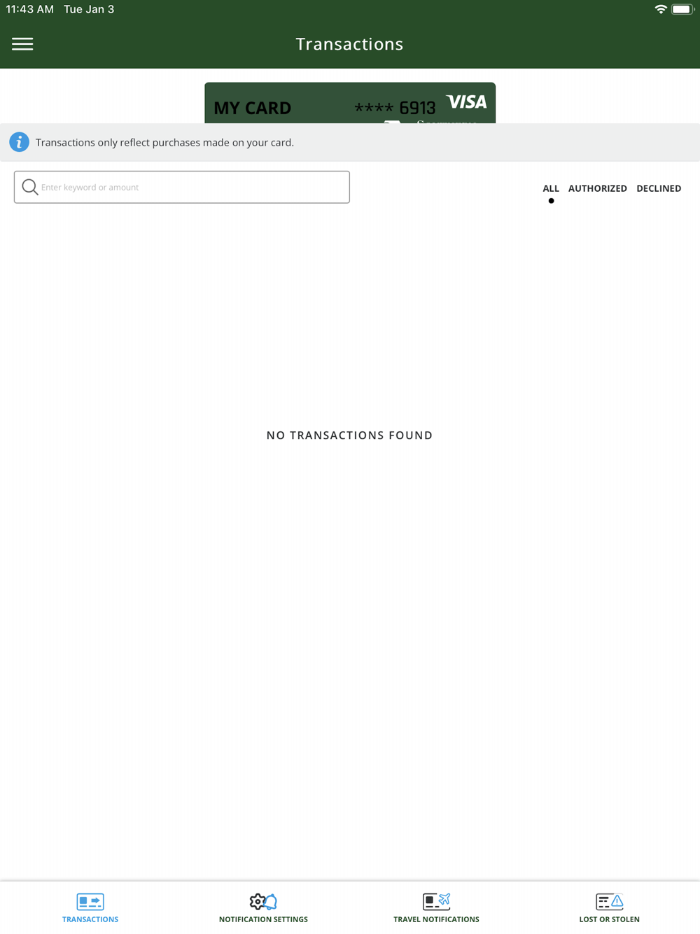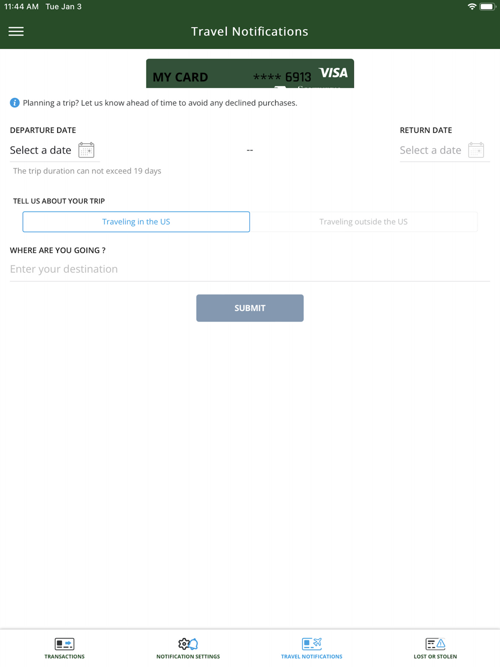 • Set your own travel notifications- don’t have your card denied for out-of-town purchases, set it and forget it