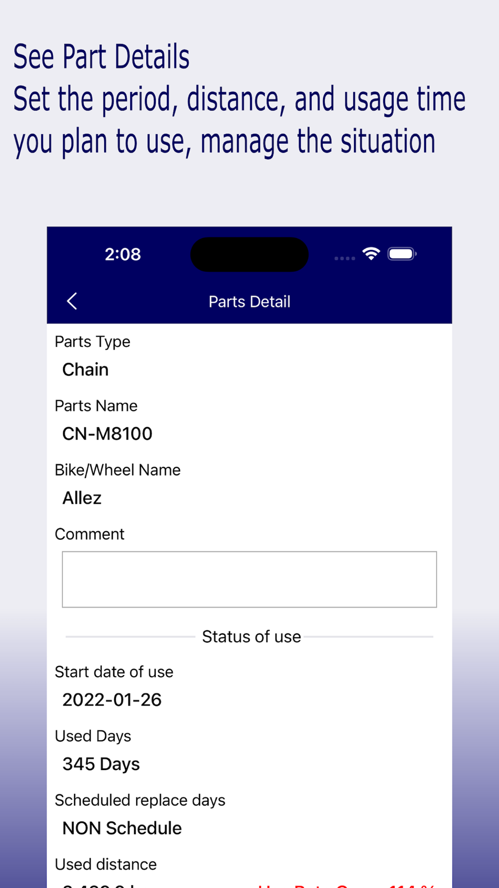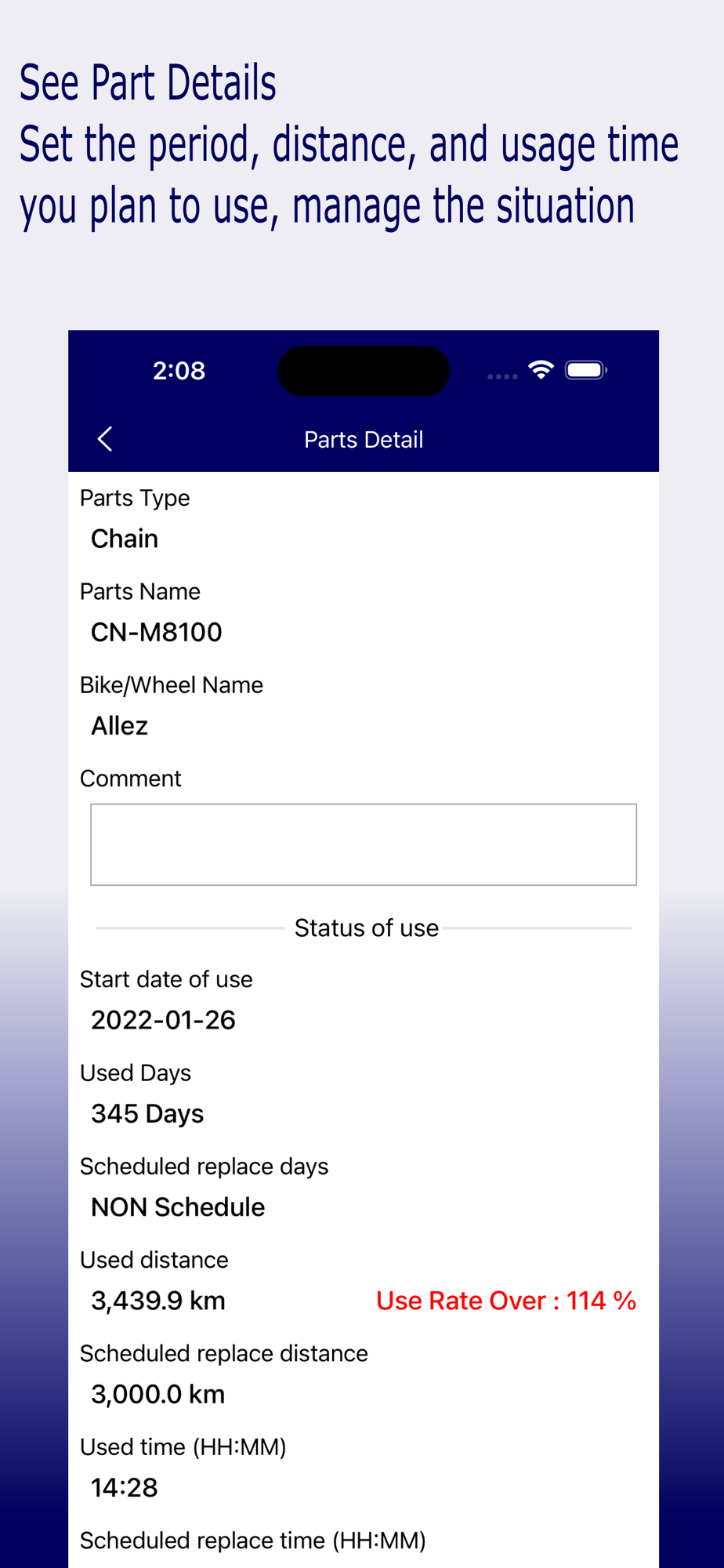 ・Setting maintenance, scheduled replacement time, usage distance, and usage time for each part