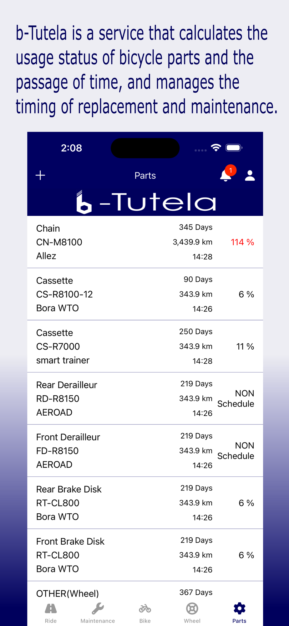 b-Tutela is a service that calculates the usage status of bicycle parts and the passage of time, and manages the timing of replacement and maintenance.
