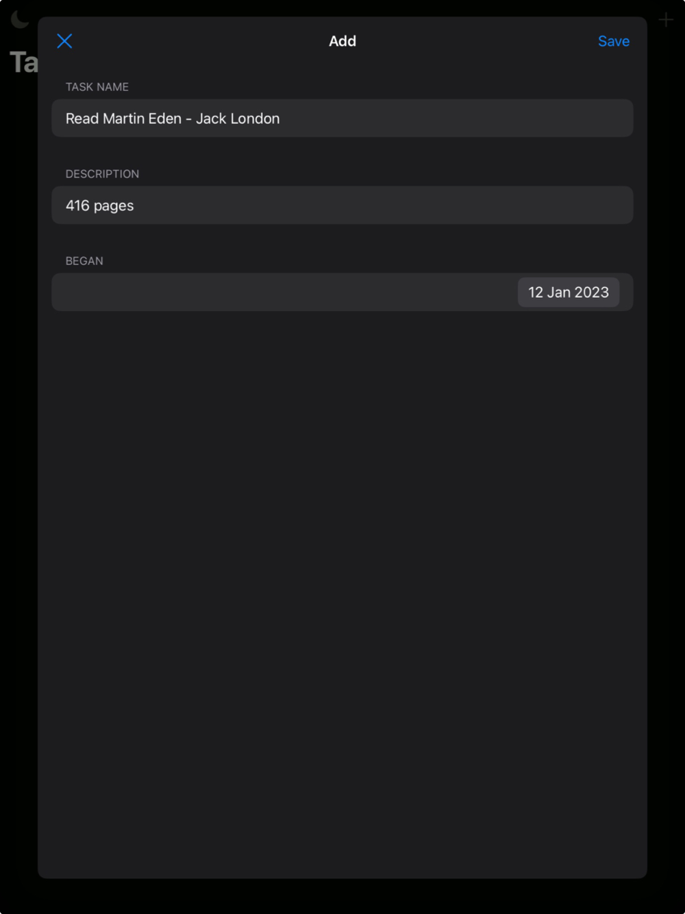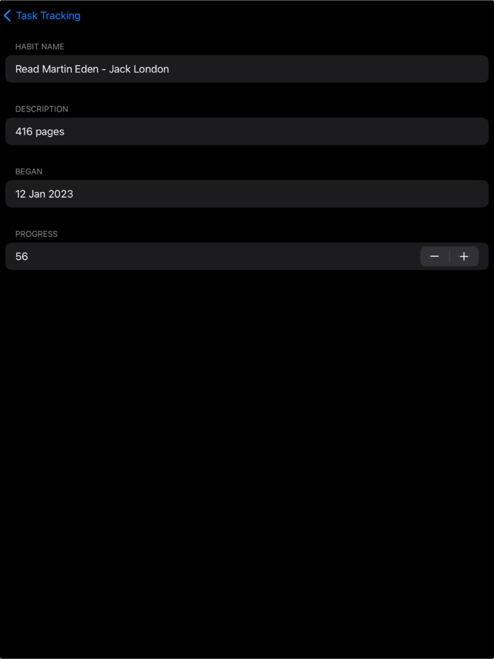 The "Task tracking Pro" application was created to track the progress of tasks. There are four items in the application: 1) the name of the task, 2) the description of the task, 3) the start date of the task, 4) tracking habits using the plus and minus buttons, progress is displayed on the main screen in numbers. For example, you created a task with the name - don't eat sweets, then added the number of days without sweets to the description, after that you set the date from which you started following the habit, and use the plus and minus buttons to adjust your progress. The app also has a simple and intuitive interface for everyone.