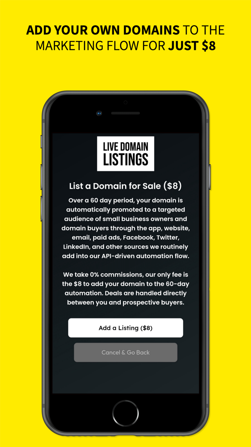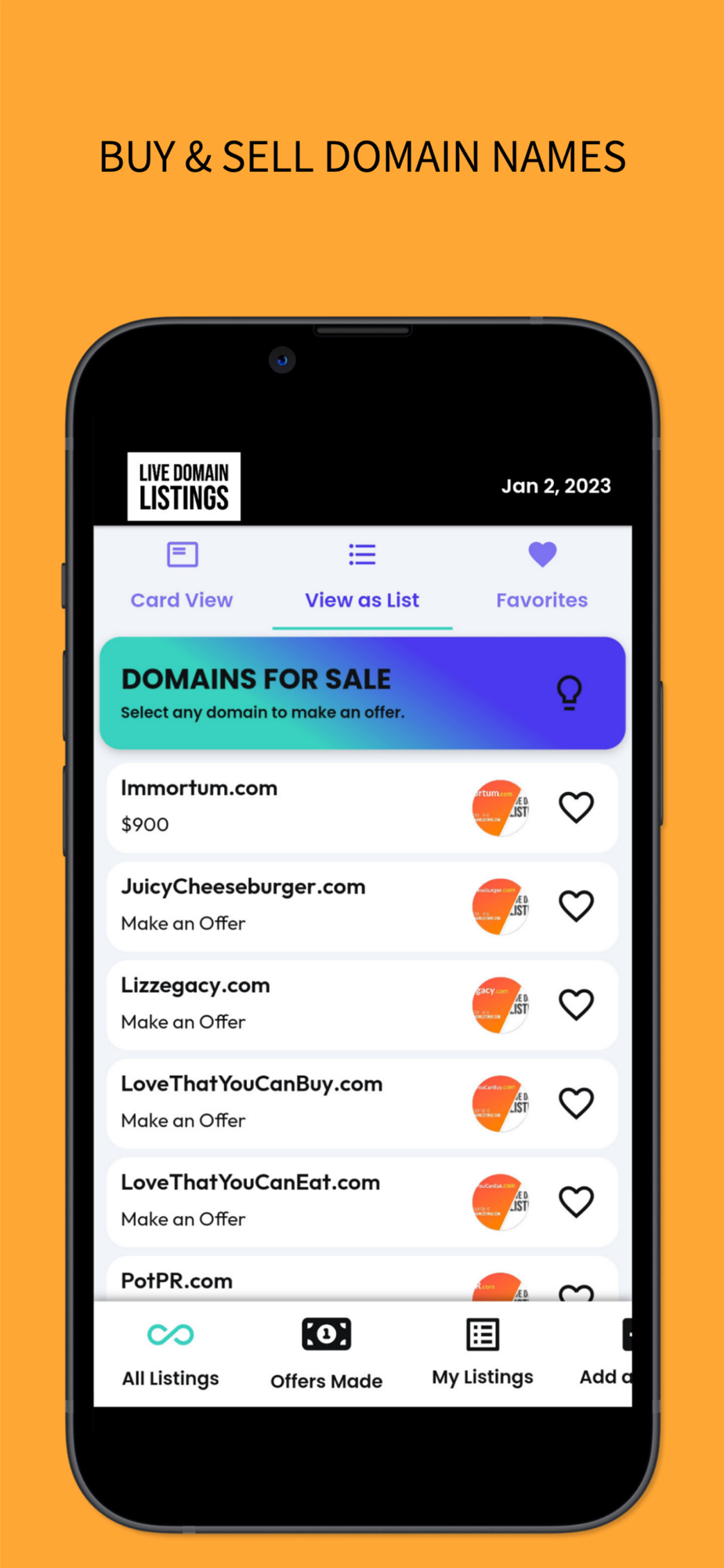 LiveDomainListings is a secondary domain market, allowing buying and selling of domain names between individual owners. Find great domains available for sale, and list your domains for sale in our 60-day domain promotional flow for just $8.