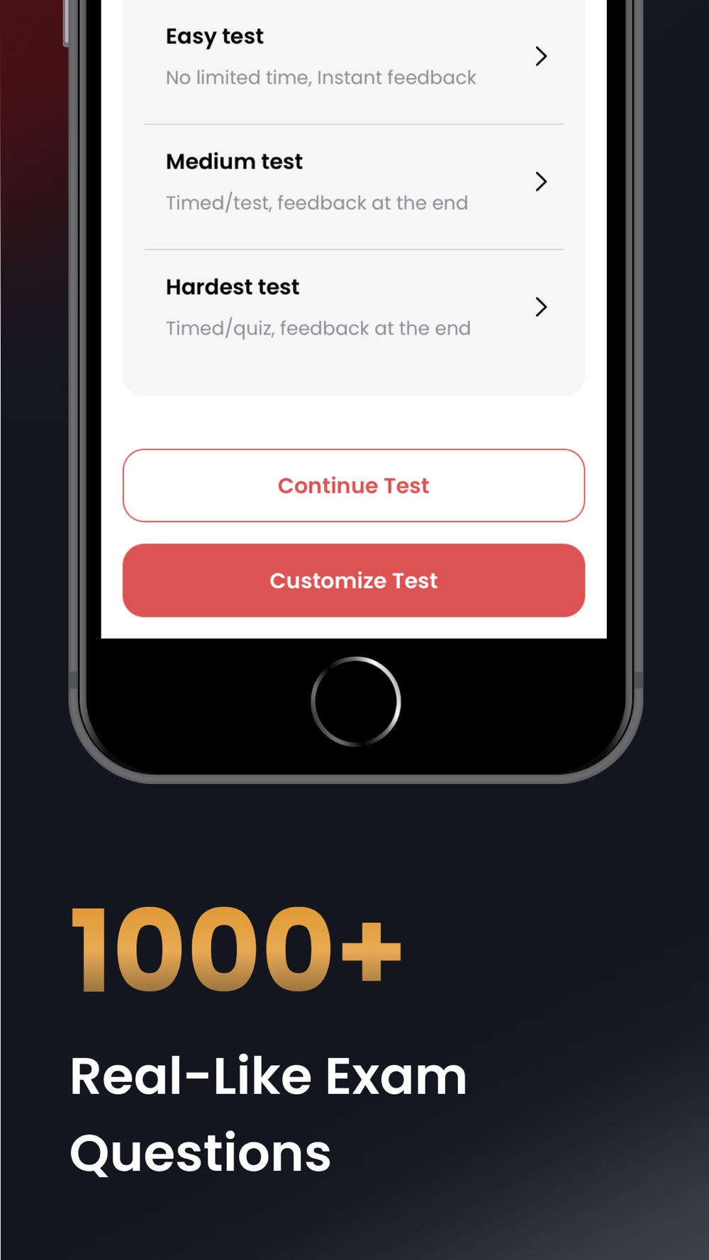 • Mock test: Mock test simulates the real test format. When you finish the test you will see your score and review all the questions.
