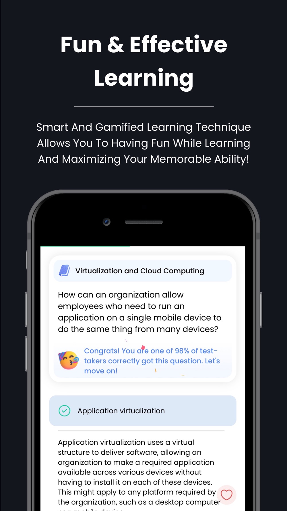 • New questions every time: to keep you on your toes, we randomize questions and answers each time you restart a practice test