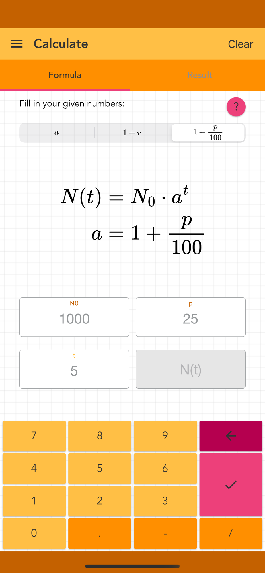 The missing value will be calculated step by step. If it growths or decays depends on the input you deliver. The app also creates a graph to give an impression of your function. An infographic shows how your input affects the growing or decaying of your starting value.