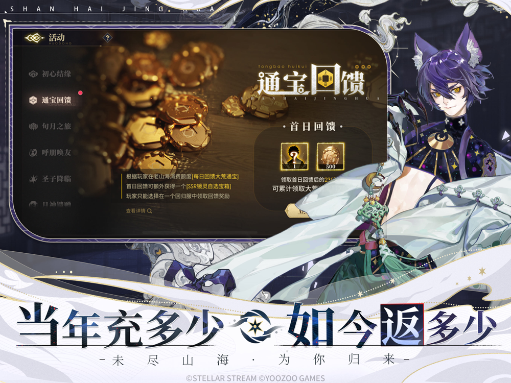 老玩家回归礼,100%返还代金券。为感谢曾经支持过《山海镜花》的龙子大人,公测当天,将开启老玩家【专属服务器】,使用老账号登录游戏即可领取老玩家专属福利。除此之外,曾经有付费的老玩家会按照历史累计充值100%返还代金券。