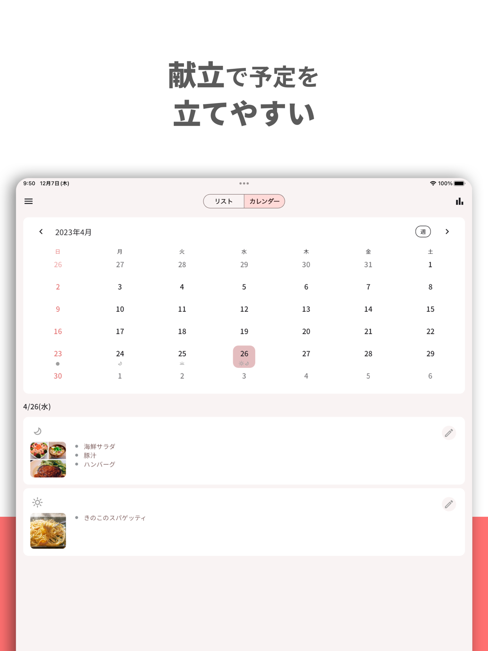 献立に登録したレシピはスワイプで簡単に切り替えて確認することができます。