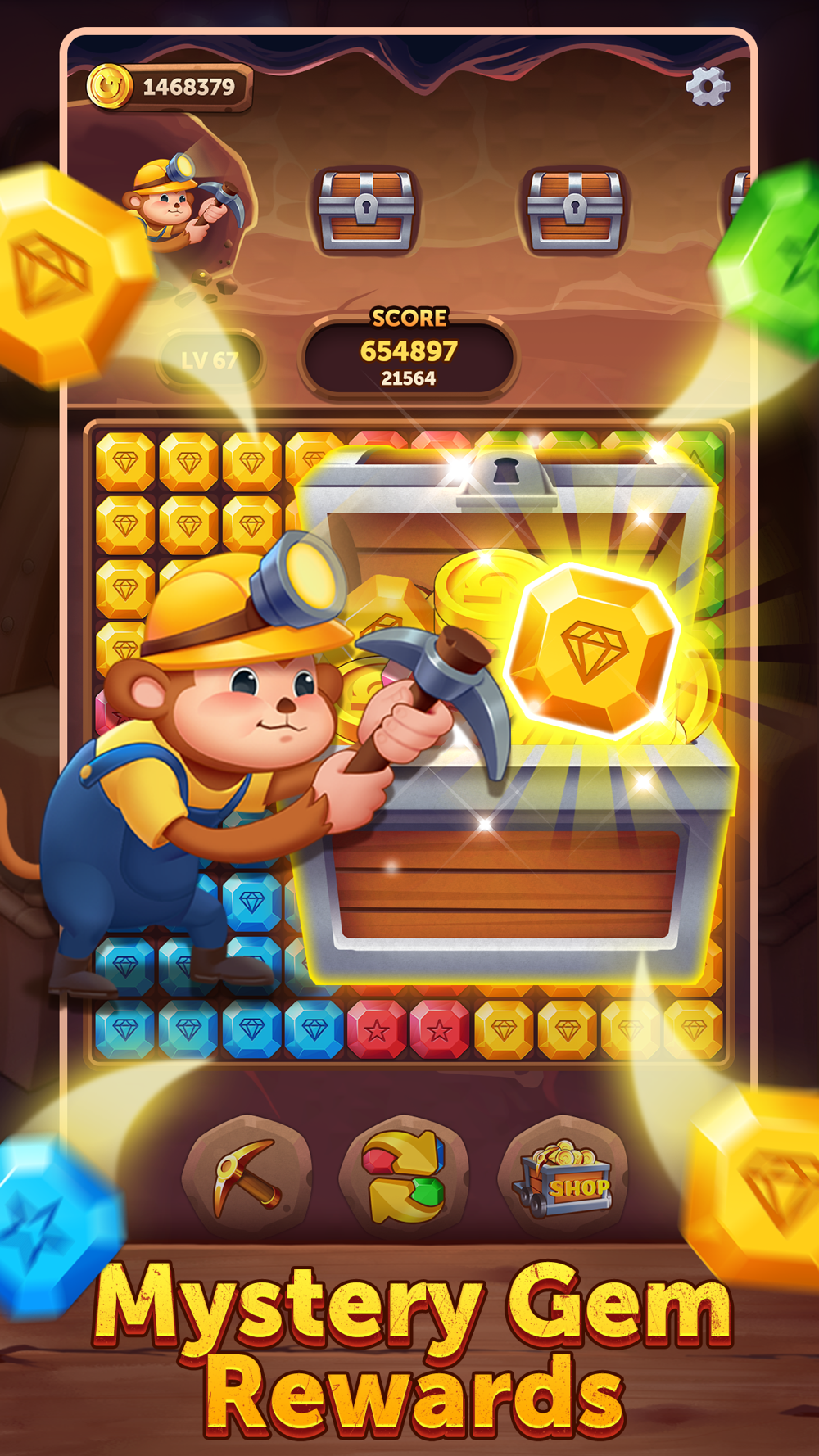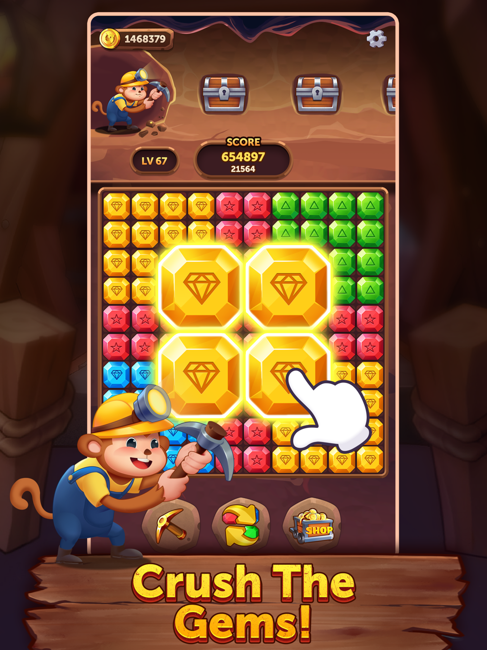In our game, there will be a lovely monkey to accompany you in digging gems.