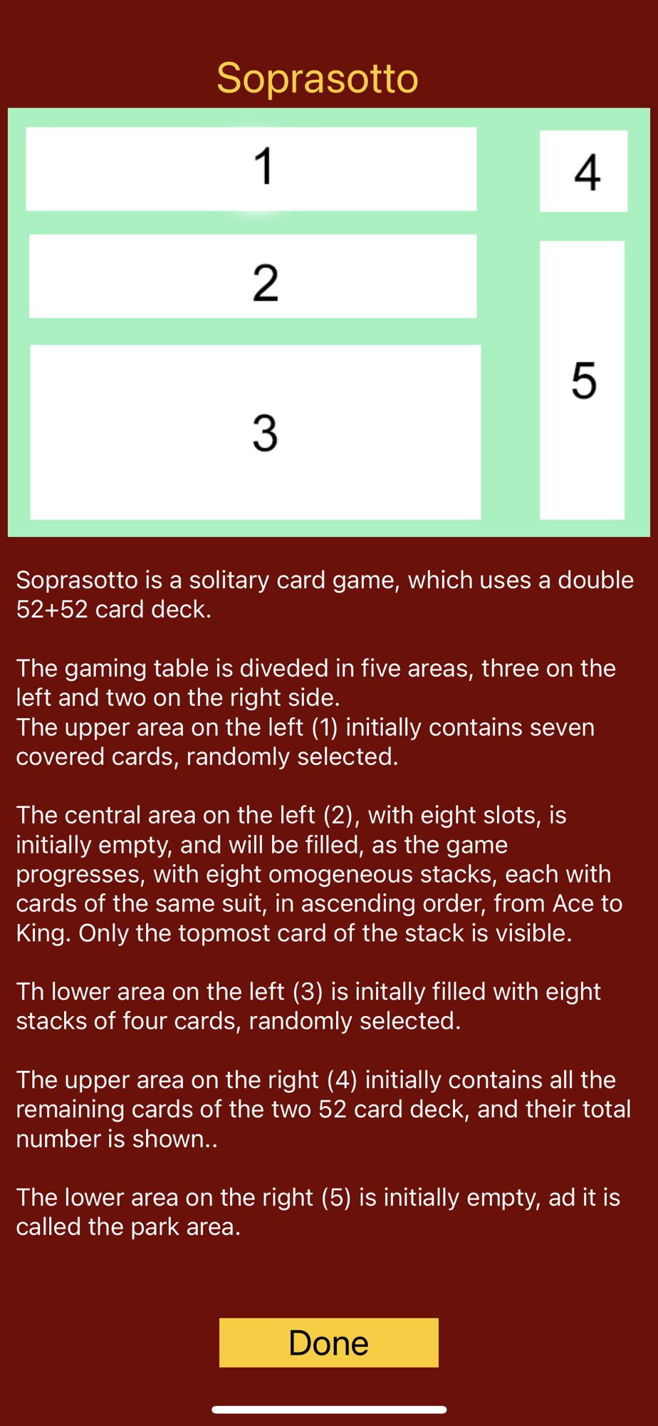 Soprasotto is a solitary card game, which uses a double 52+52 card deck.