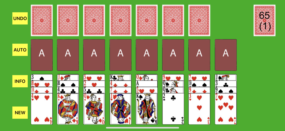 The central area on the left (2), with eight slots, is initially empty, and will be filled, as the game progresses, with eight homogeneous stacks, each with cards of the same suit, in ascending order, from Ace to King. Only the topmost card of the stack is visible.