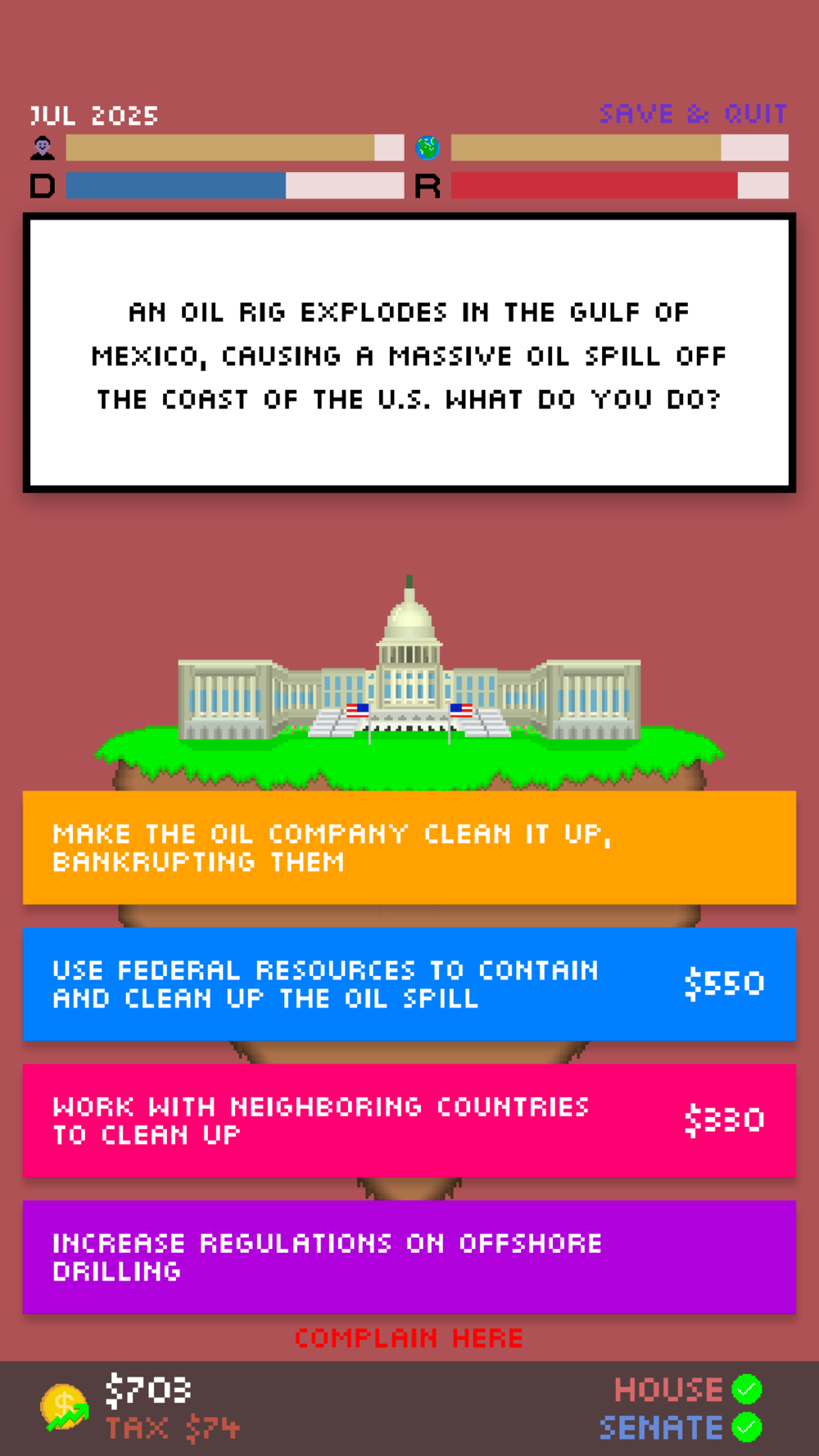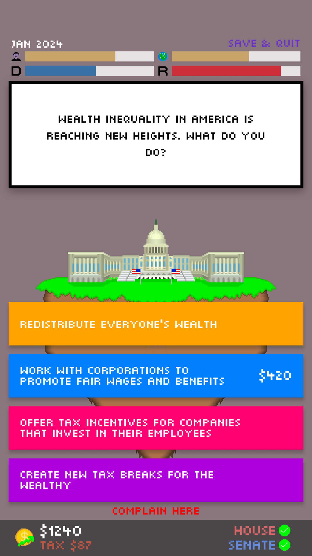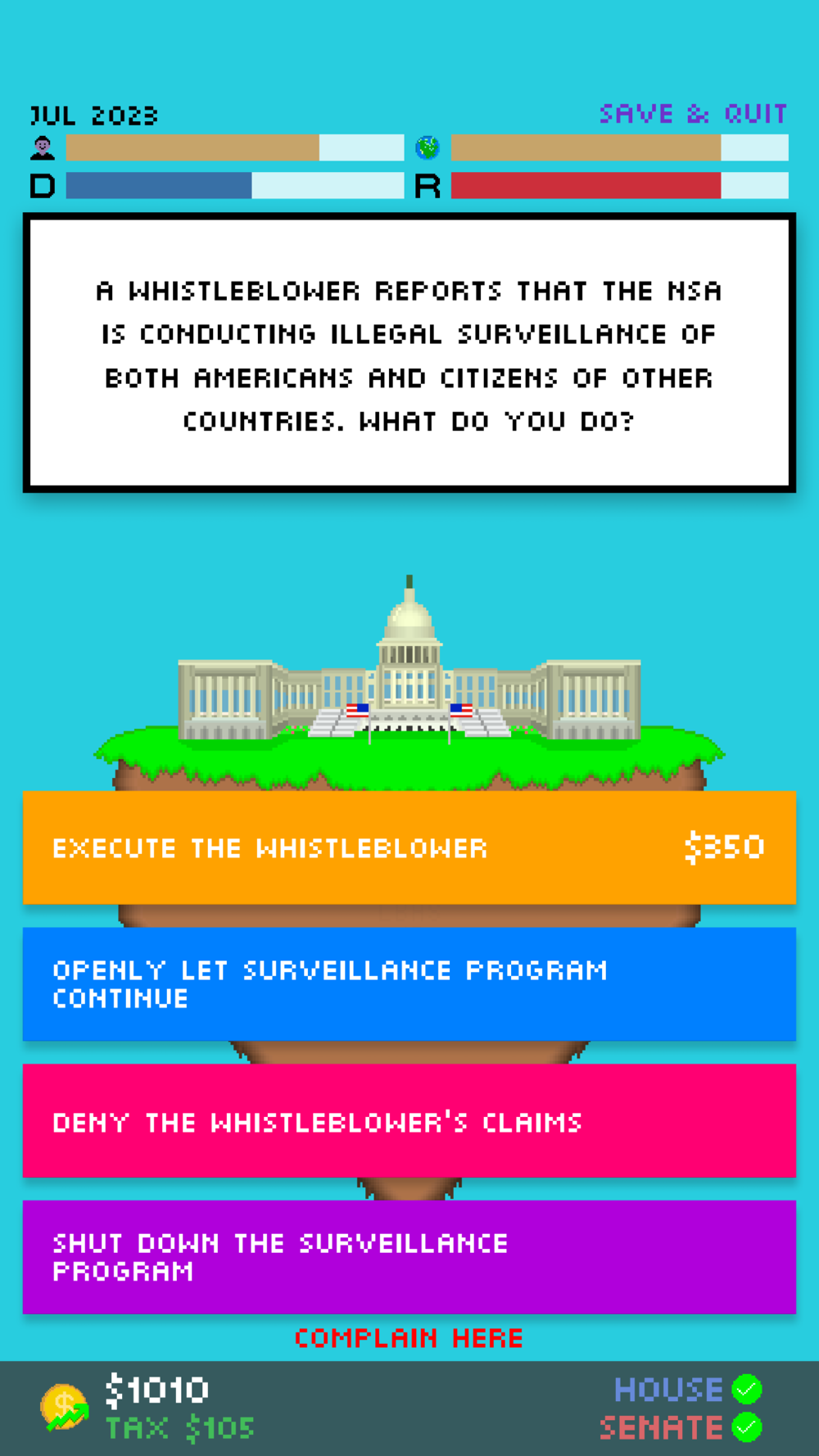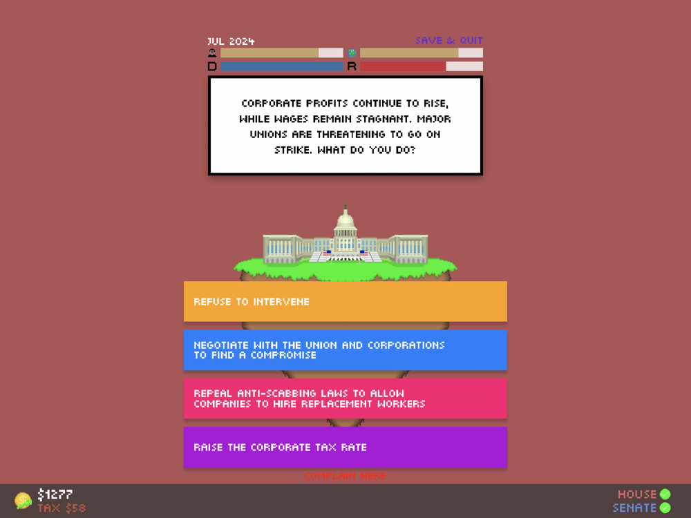 I have taken the feedback received by Impeached: Be The President constructively, and have changed many things to make the gameplay experience better. Enjoy!