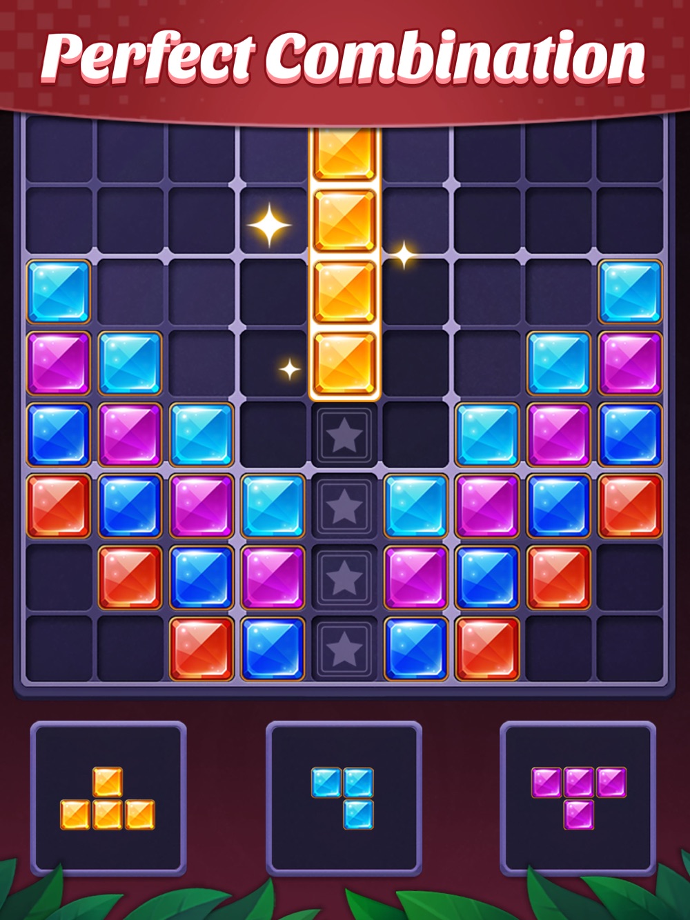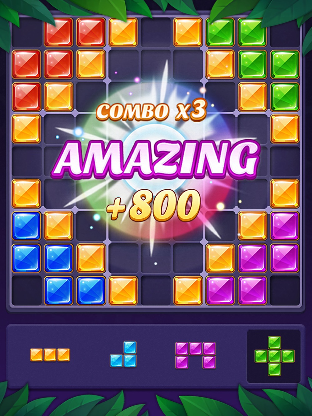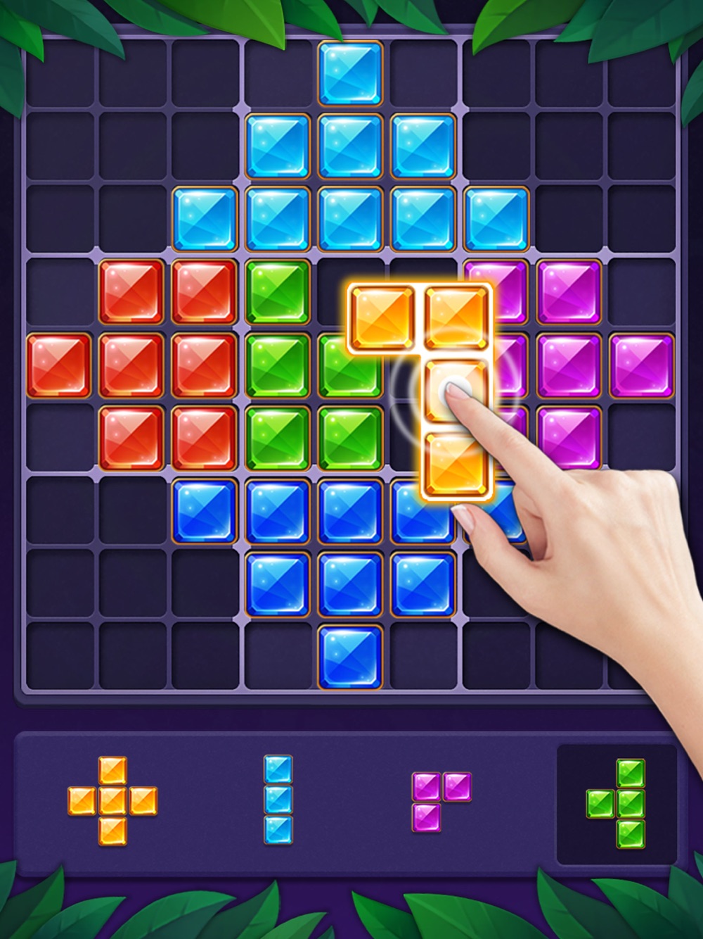 - Drag and drop gem blocks into the 9×9 grid.