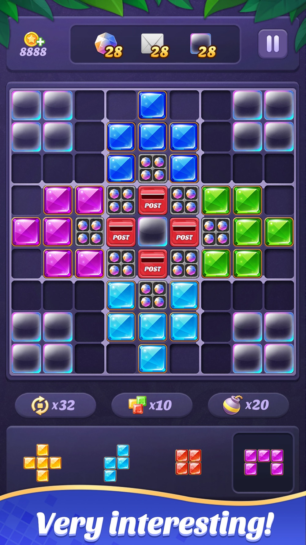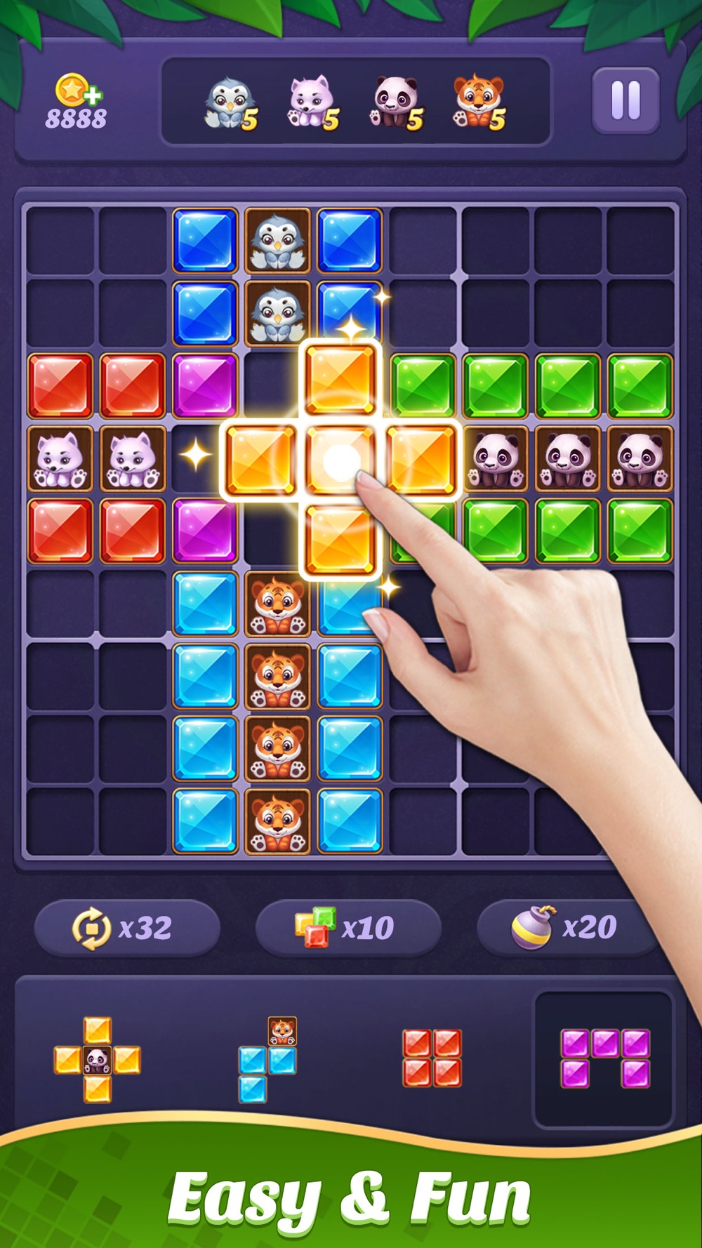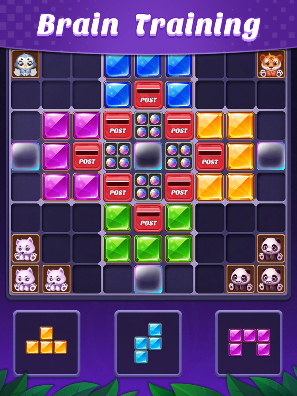 - Drag and drop gem blocks into the 9×9 grid.