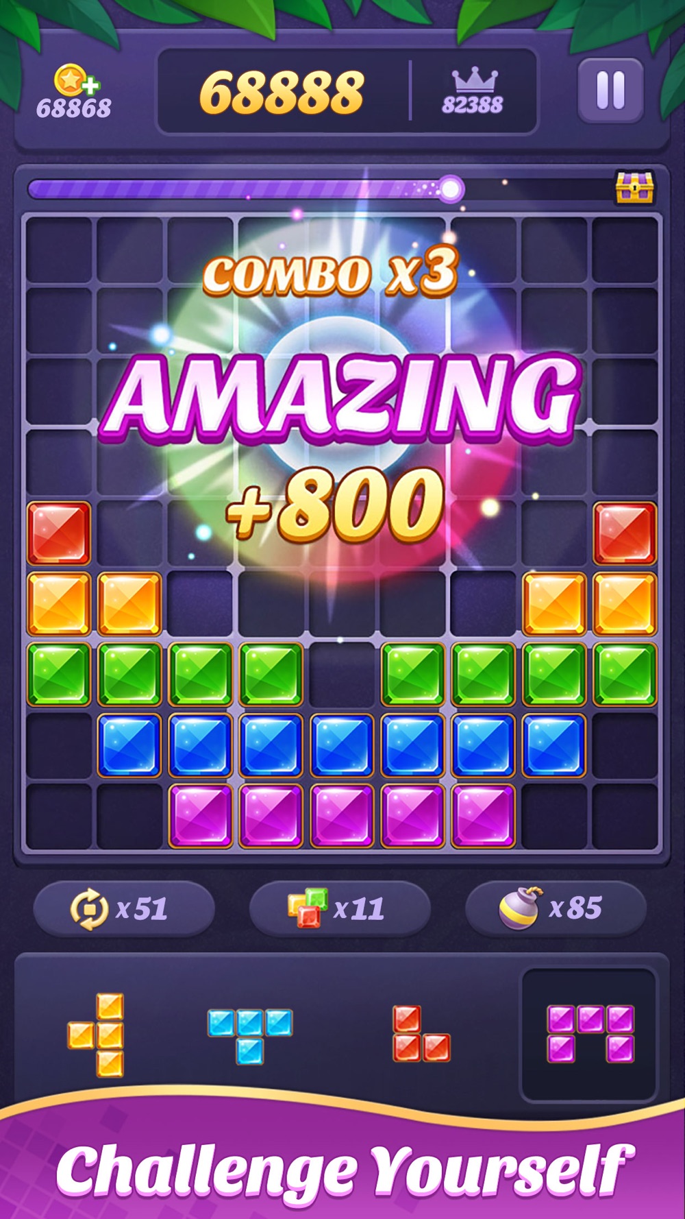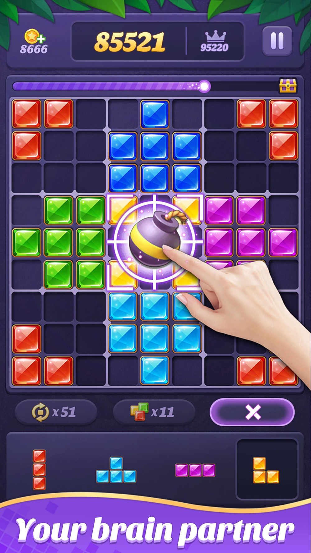 Simple and addictive! Easy to play yet challenging to master! Block 99 Go: Gem Puzzle is a stress-relieving and brain-healthy block puzzle game. Try to destroy as many block figures as possible and break your highest score with the help of powerful props!