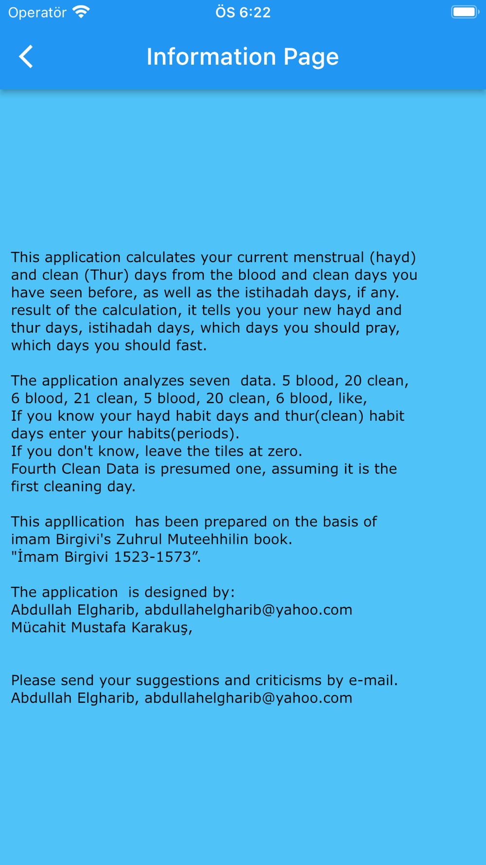 This application calculates your current menstrual (hayd) and clean (Thur) days from the blood and clean days you have seen before, as well as the Istihaadah days, if any.