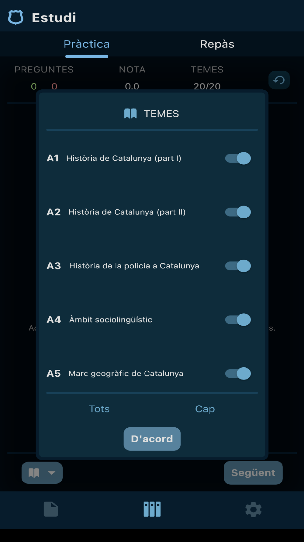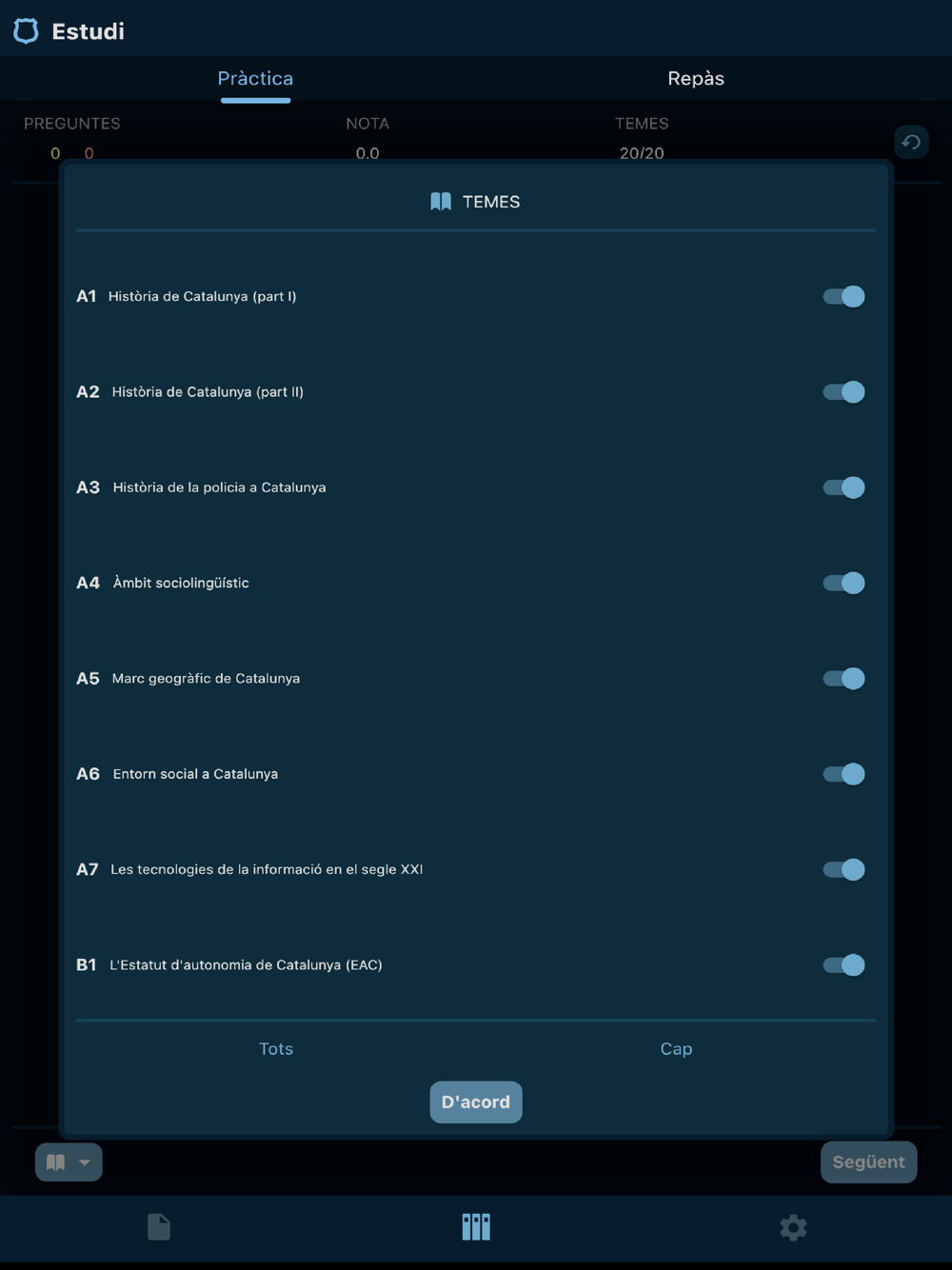 - Podràs revisar els temes que portes millor i pitjor i comparar la teva nota amb la nota mitjana de la resta d’usuaris.