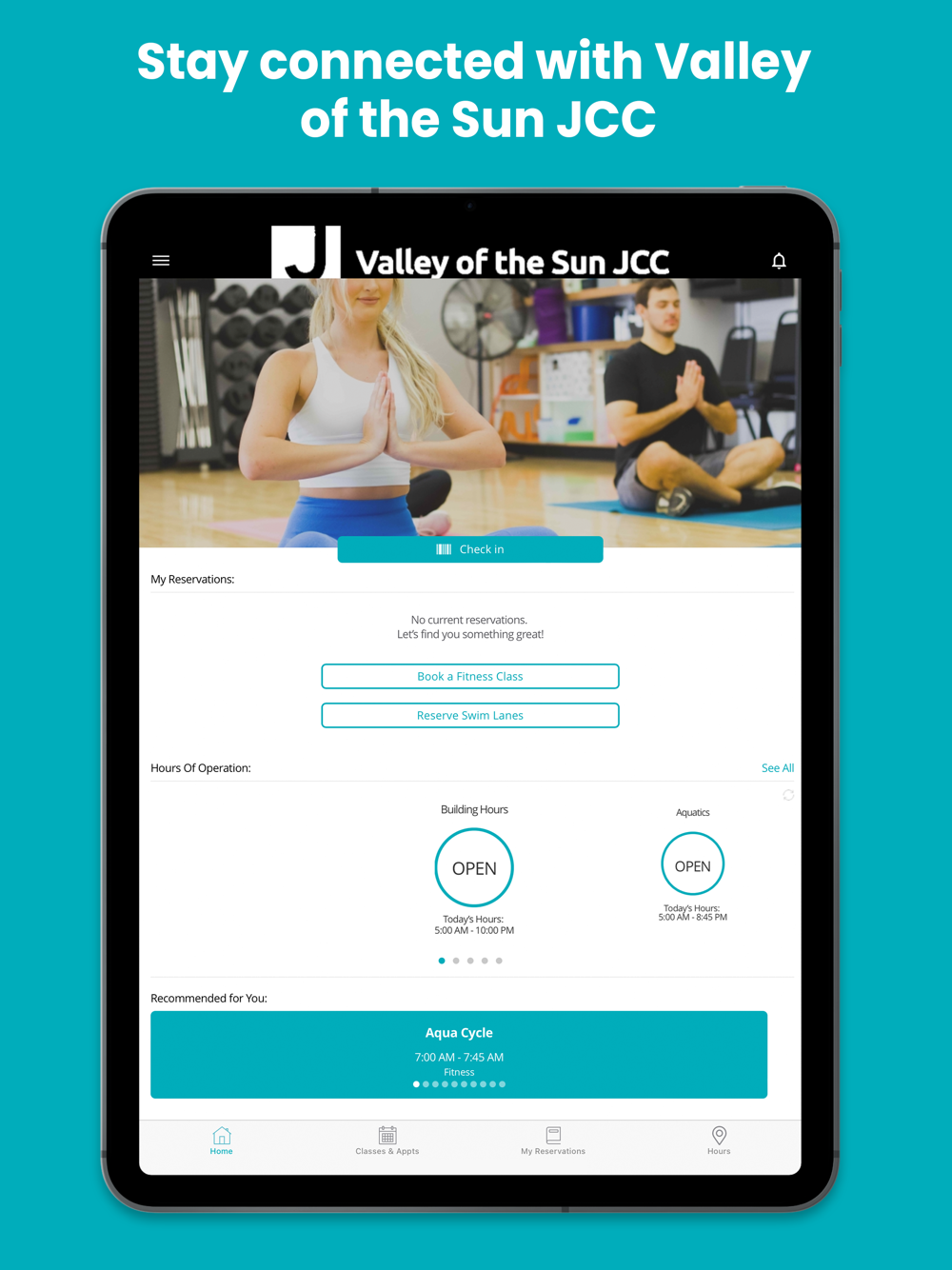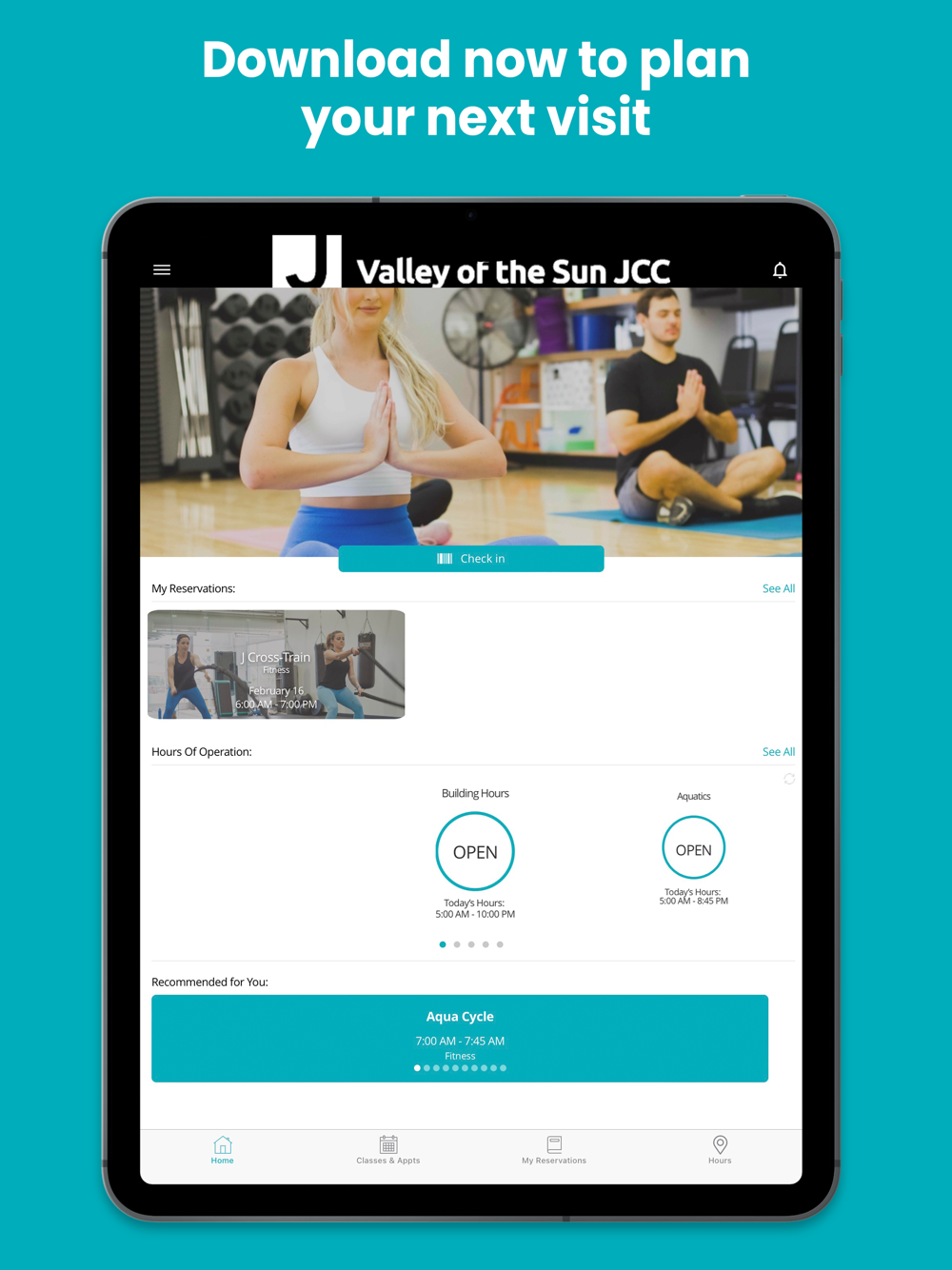 Download The J mobile app to register for fitness classes, discover programs, receive alerts and push notifications, check in with your barcode and much more. Let’s get active!