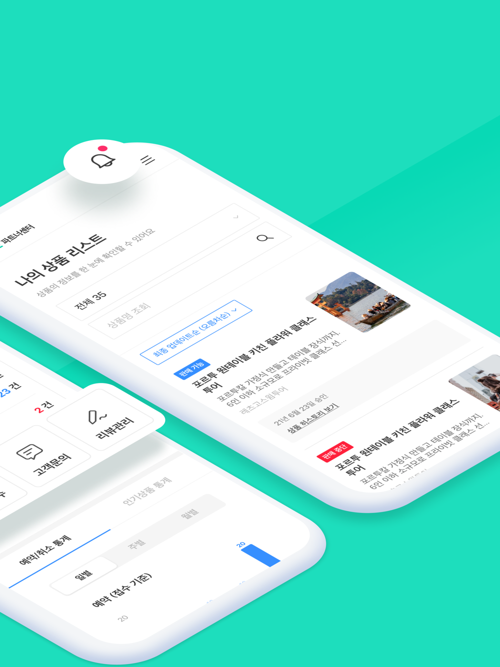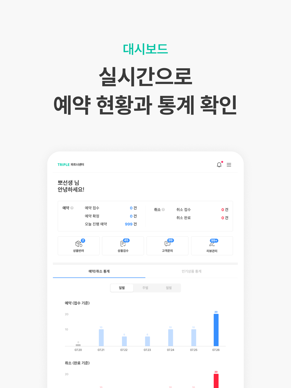 실시간으로 예약/취소 현황과 인기상품 통계 및 문의현황 등