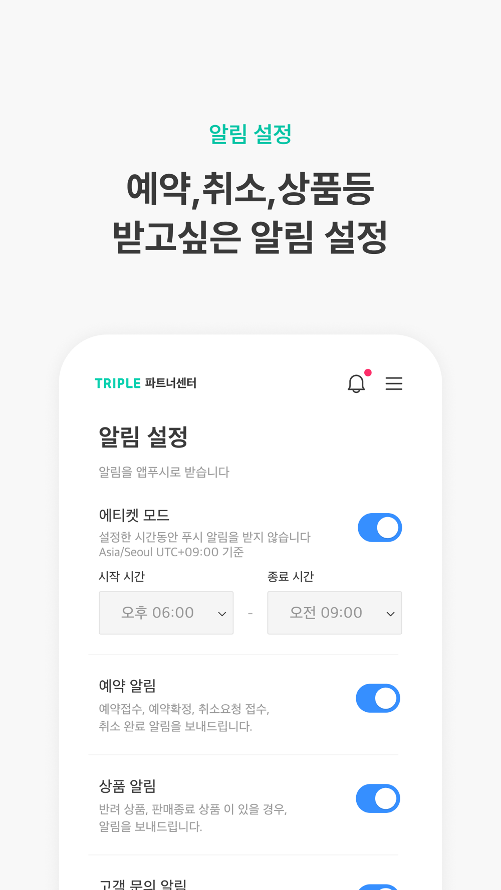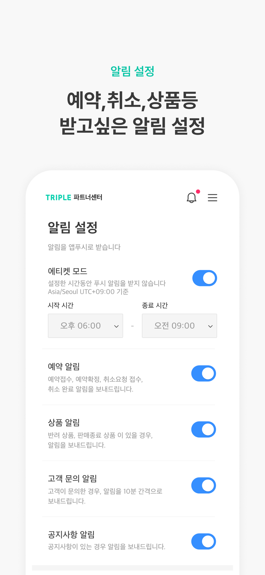 예약과 취소, 상품에 대한 현황 등 받고 싶은 알림을 설정할 수 있습니다.
