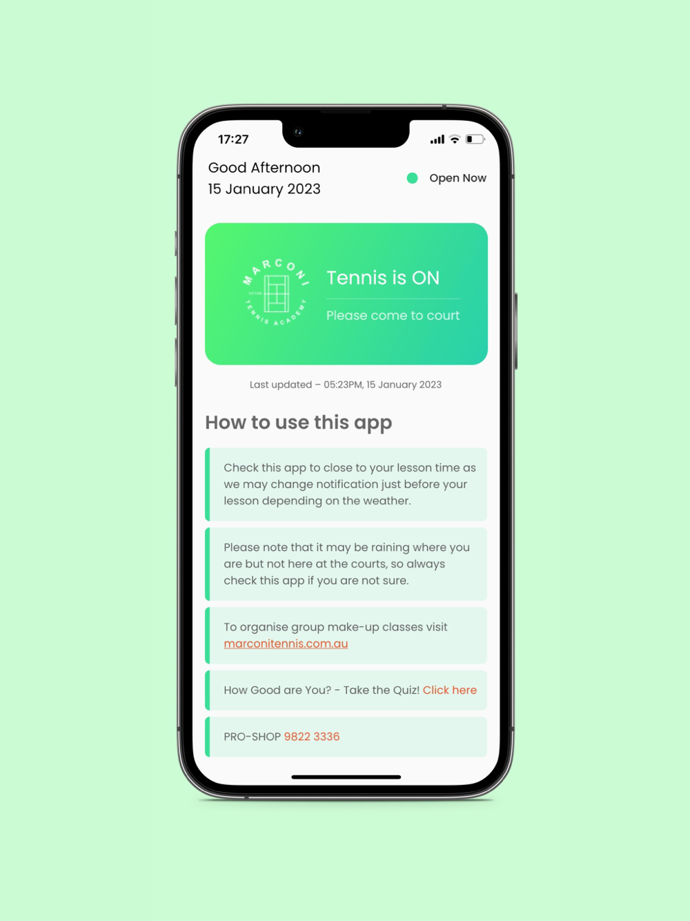 This simple app lets you know if tennis lessons are on or off at the Marconi Tennis Academy.