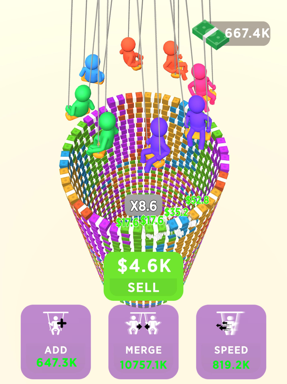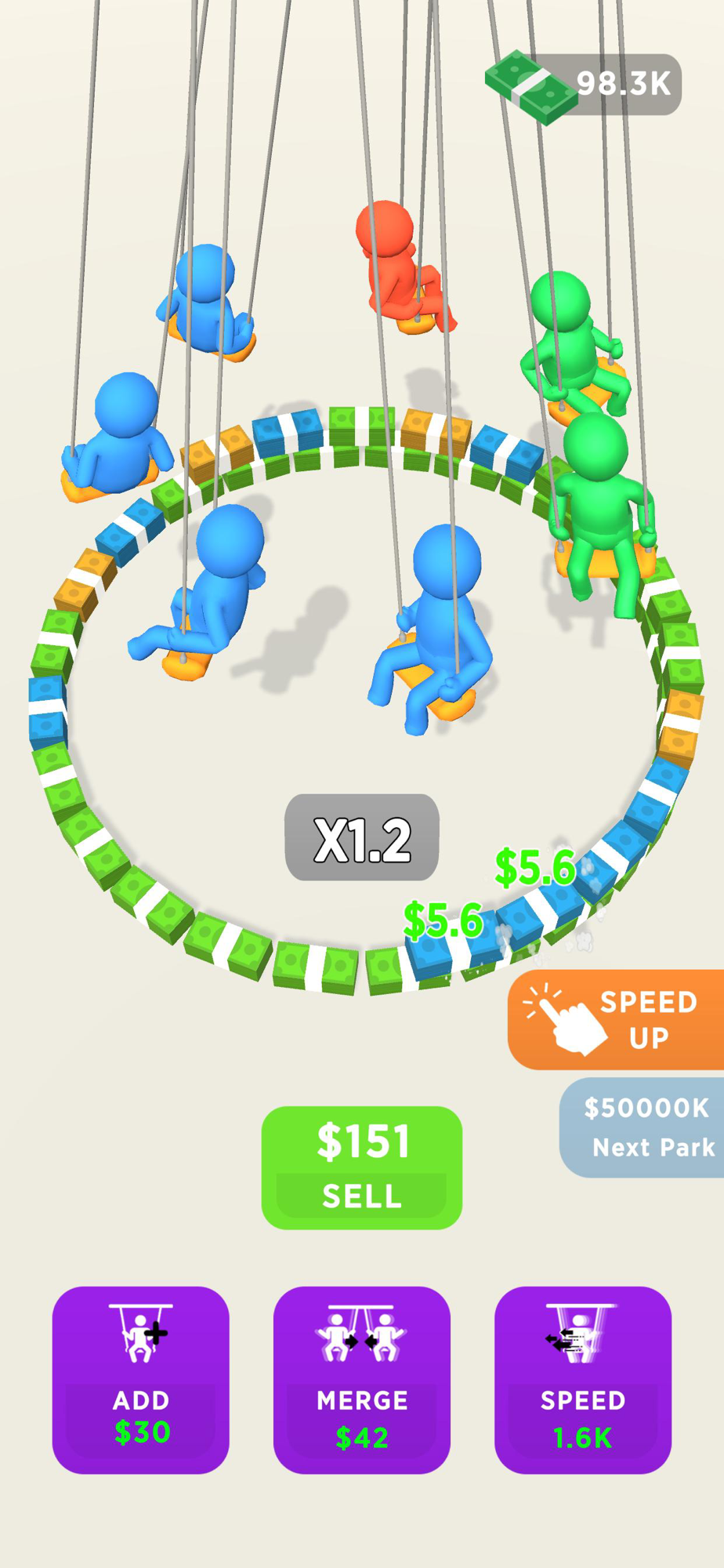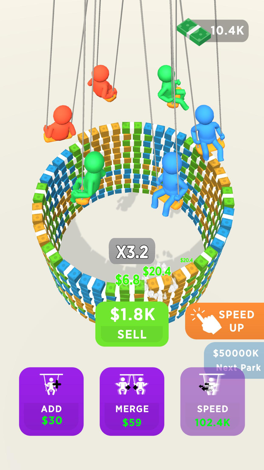 Tap the screen to make the swing go faster and make your customers happy, so they can pay your services. Use your money to buy new swings so more customers can enjoy it. Or, use your money to merge your customers into better customers who pay even more! Or even better yet, use your money to upgrade your swing's speed! The possibilities are endless!