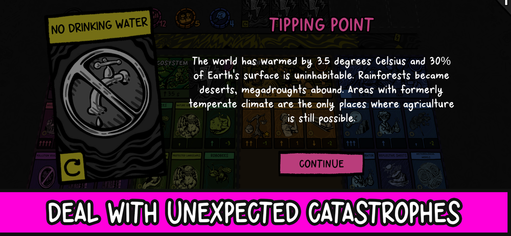 Game cards represent inventions, laws, social advancements, or industries - each designed on the basis of real-world climate science. In addition, partially randomized world events occur, forcing you to adapt your strategy. Gradually unlock new cards in the game encyclopedia and chart your path towards a new future.
