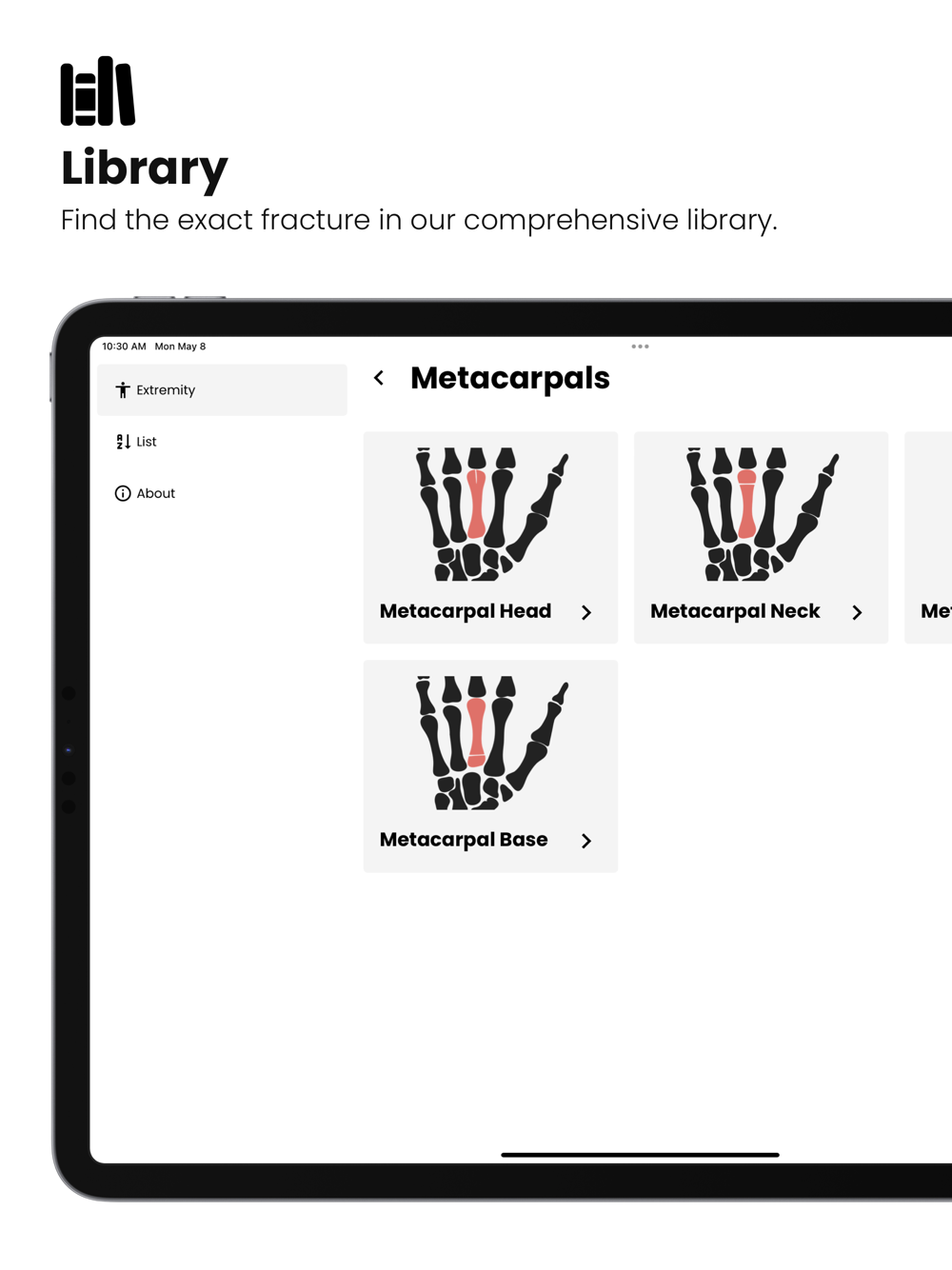 - Easy-to-use interface: Use our bone map to select the injured region and get a selection of fractures. You can also search through a comprehensive list with just a keyword.